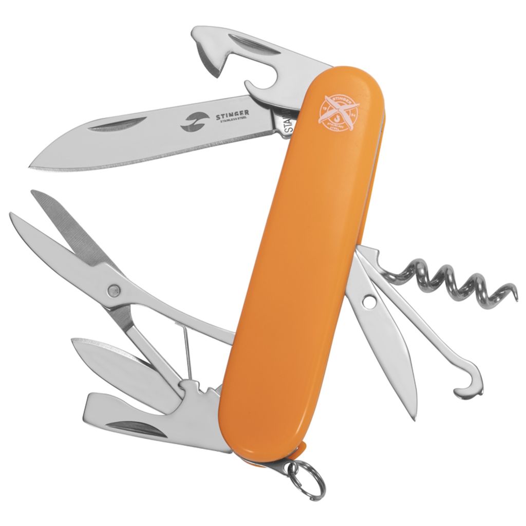 Нож перочинный STINGER имеет 13 функций:1. Большое лезвие2. Консервный нож с:3. – Малой отвёрткой4. Малое лезвие5. Открывалка для бутылок с:6. – Отвёрткой7. – Инструментом для снятия изоляции8. Ножницы9. Многофункциональный крючок10. Штопор11. Шило с:12. – Иглой13. Кольцо для ключей