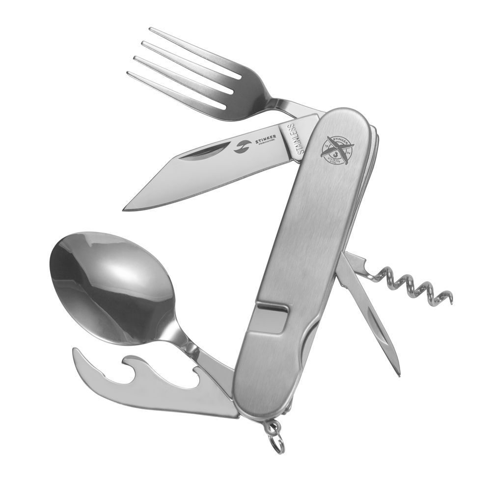 Нож перочинный STINGER имеет 8 функций:1. Лезвие2. Ложка3. Вилка4. Открывалка для бутылок5. Консервный нож6. Ледокол7. Штопор8. Кольцо для ключей