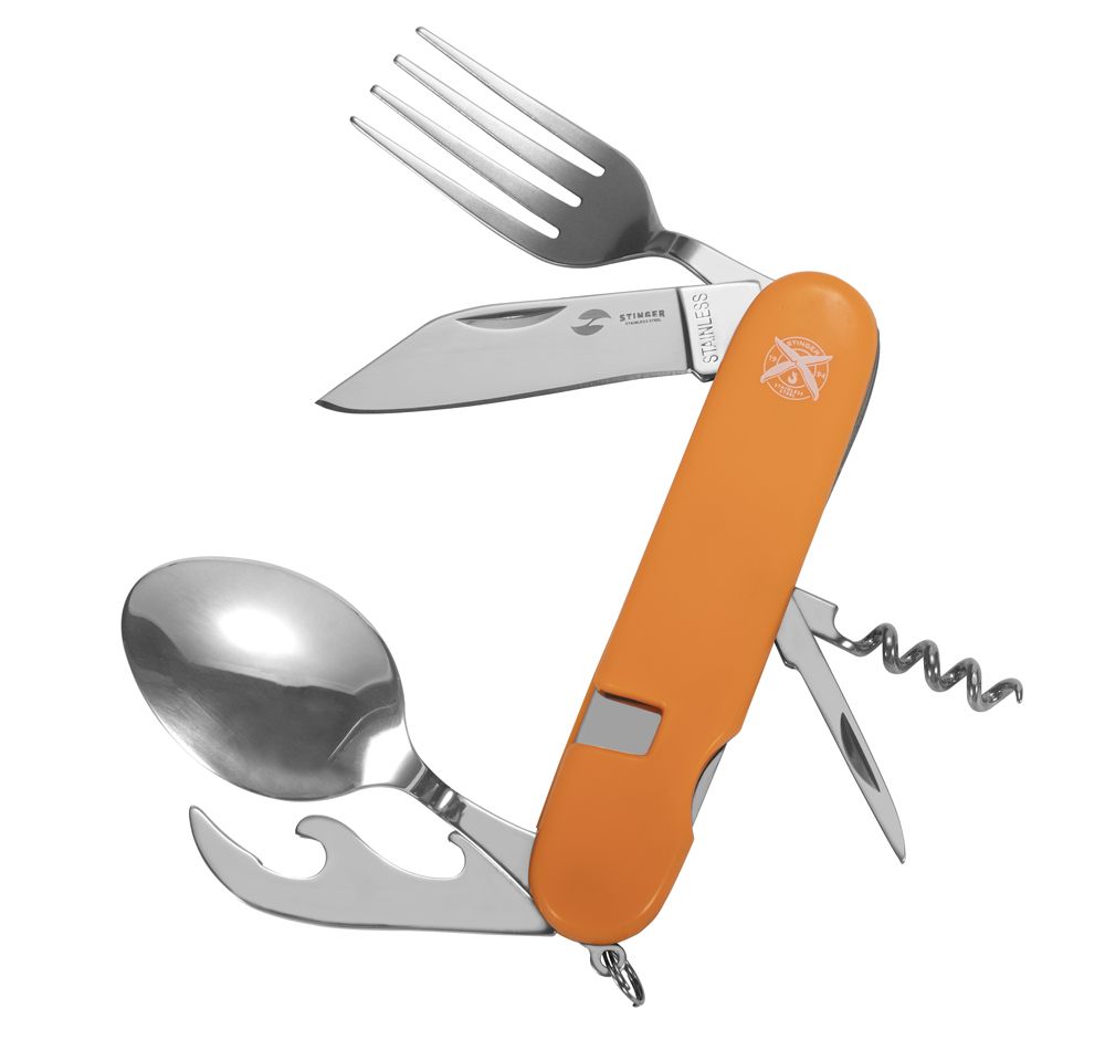 Нож перочинный STINGER имеет 8 функций:1. Лезвие2. Ложка3. Вилка4. Открывалка для бутылок5. Консервный нож6. Ледокол7. Штопор8. Кольцо для ключей