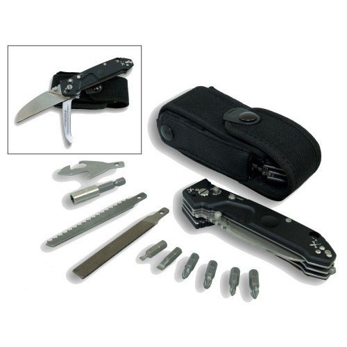 Нож складной с выкидным стропорезом Police EVO, сталь 690, пила, напильник, отвертки, открывалка, классический сатиновый + стропорез автоматический, рукоять черная алюминевая, чехол черный нейлон.