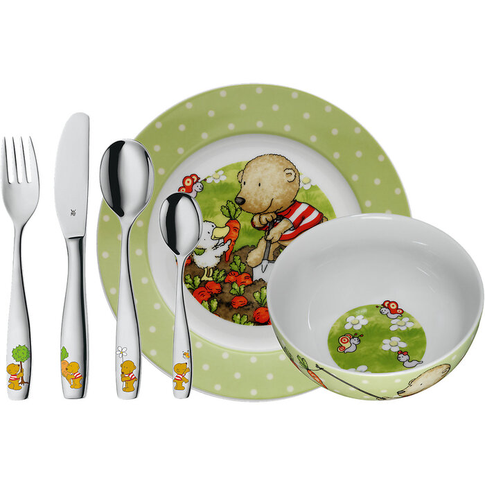 Набор детской посуды Pitzelpatz от WMF разработан специально для детей от 3х лет. Состоит из шести столовых приборов: ложки, вилки, ножа, десертной ложки, и двух предметов посуды: пиалы и тарелки.