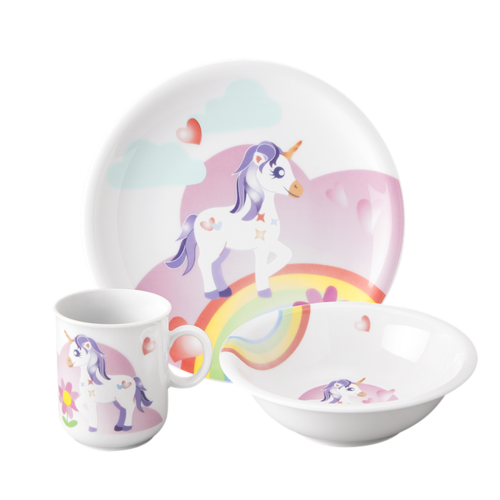 В набор детской посуды входят: 1 чашка, 0,25 л, 1 тарелка для завтрака диаметром 19 см, 1 пиала диаметром 16 см.