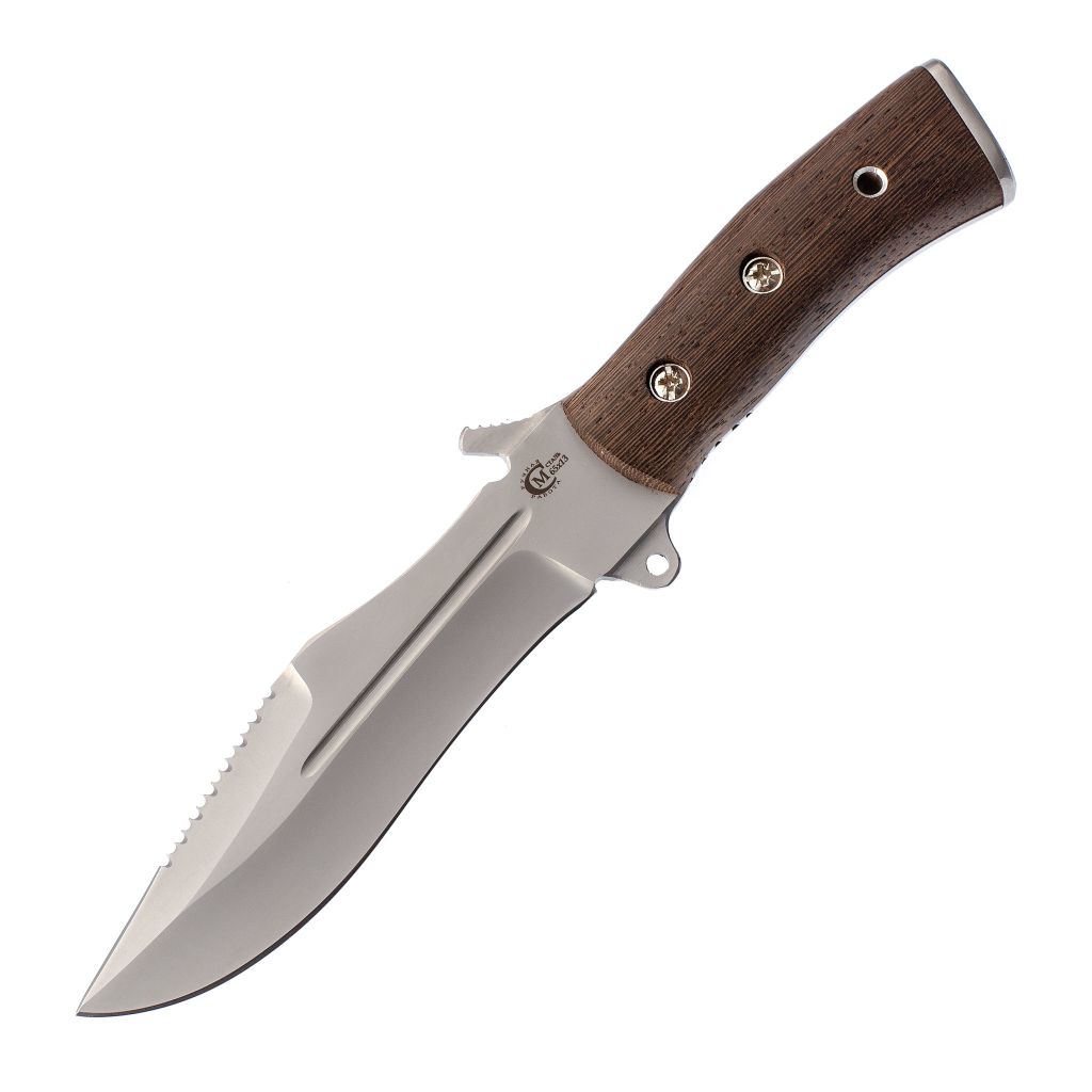Рукоять ножа выполнена по технологии Full-Tang, что обеспечивает ему феноменальную прочность. Накладки из древесины венге отлично заполняют руку, обеспечивая комфортное и надежное сцепление. Благодаря небольшому изгибу ручка идеально ложится в ладонь, что позволяет уверенно контролировать движения при работе с ножом.