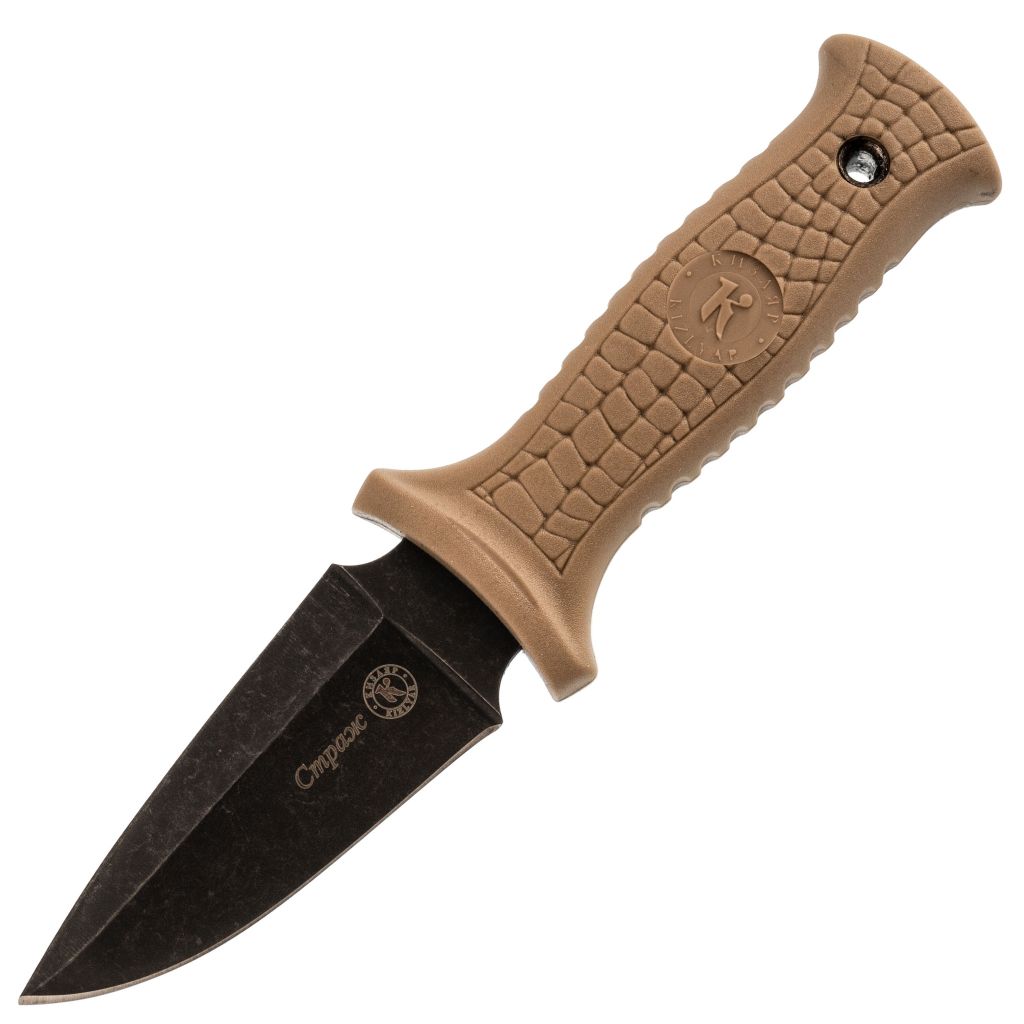 Интернет-магазин NOZHIKOV представляет нож Страж из стали AUS-8, твердость 58-60 HRC для любителей. Это популярная российская компания, которая выпускает надежные колюще-режущие аксессуары. Данная модель снабжена прочным стальным лезвием, которое прошло дополнительную термическую обработку BlackStonewash, о чем говорит характерный черный цвет. Покрытие защищает от коррозии и царапин. Тактический клинок укомплектован эргономичной рукояткой из материала под названием эластрон цвета хаки. Также бывает песочным и не скользит в руках.