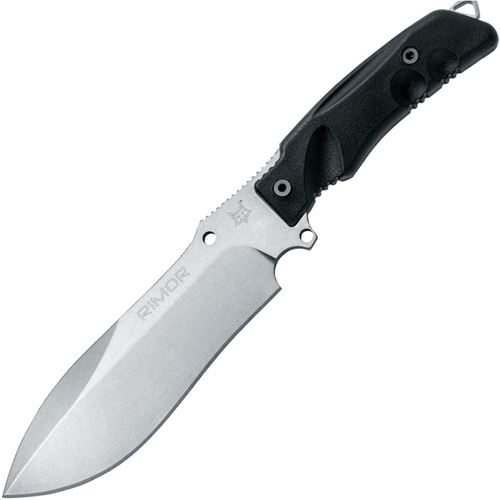Rimor - нож с фиксированным клинком от ведущего итальянского производителя Fox. Это универсальный инструмент, который отлично подходит для применения в полевых условиях, созданный на основе таких моделей как Predator, Parus и Parang. Туристический нож для выживания имеет полнохвостовую конструкцию. Для лезвия использована сталь N690 с твердостью 58-60 HRC. Клинок оснащен противоскользящей насечкой на обухе и двумя универсальными отверстиями у основания. Рукоять в данной модели выполнена в виде черных накладок из нейлона, усиленного стекловолокном. Она имеет эргономичную форму с подпальцевыми выемками для максимально надежного хвата. Полевой нож Rimor укомплектован прочным нейлоновым чехлом с универсальным съёмным креплением под брючный ремень.