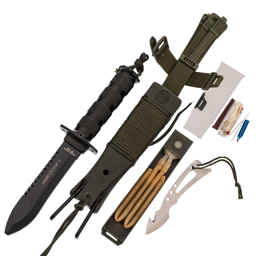 Металлическая рукоять ножа скрывает внутри герметичную капсулу с набором предметов первой необходимости: скальпель, лейкопластырь, пинцет, рыболовные снасти, иголки, нитки, спички и карандаш. Компас, встроенный в крышку, помогает ориентироваться на местности. Темляк из прочного шнура повышает удобство транспортировки и фиксации ножа.
