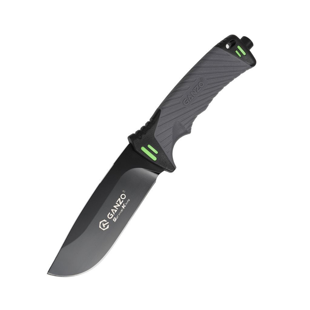 Нож для выживания с огнивом и точилкой Ganzo G8012 пользуется популярностью среди путешественников, туристов, спасателей и фанатов активного отдыха. Туристический нож Ganzo G8012 оснащен клинком из углеродистой стали 7Cr17MoV с прямой заточкой. Высокая устойчивость к коррозии позволяет использовать изделие даже в условиях повышенной влажности. А матовое черное покрытие придает лезвию особую твердость и износостойкость. Клинок жестко зафиксирован, благодаря чему Ganzo Survival knife G8012 справляется с высокими механическими нагрузками. Рукоять данной модели выполнена из термопластика, а чехол - из кайдекса. С обратной стороны чехла размещена точилка для гладкого лезвия. Также в чехол встроен стропорез и вынимающееся огниво. А на торце рукояти имеется небольшой плоский выступ, выполняющий роль стеклобоя.