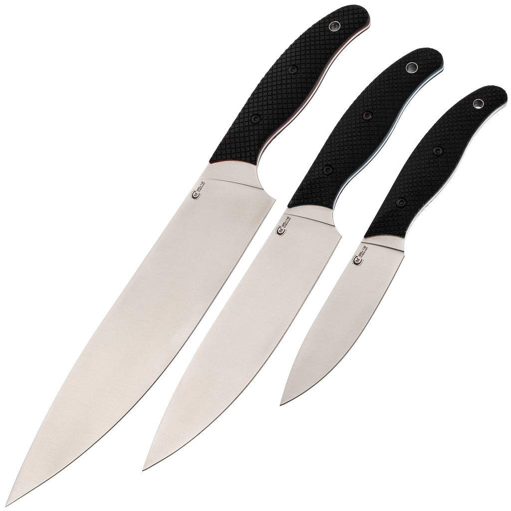 Набор "Патриот-1" - это отличный выбор для тех, кто ценит высококачественные кухонные ножи, изготовленные вручную. Он включает в себя три основных ножа, каждый из которых имеет свою специфику и предназначение. Большой Шеф-нож идеально подходит для работы с мясом, рыбой и крупными овощами, обеспечивая легкое и эффективное резание. Универсальный нож станет вашим помощником в различных задачах на кухне, а малый овощной нож позволит выполнять точные и аккуратные действия, требующие контроля.Клинки ножей изготовлены из высококачественной российской нержавеющей стали 95х18, которая широко используется в производстве туристических и охотничьих ножей благодаря своему превосходному сочетанию коррозионной стойкости, способности удерживать заточку и доступной цене. Эта сталь гарантирует, что ножи будут долго сохранять остроту и легко поддаваться заточке, что является важным фактором для повседневного использования на кухне. Клинки имеют оптимальную толщину и широкие прямые спуски, что обеспечивает превосходную режущую способность. Рукояти выполнены из стеклотекстолита G10, материала, отличающегося прочностью и устойчивостью к воздействию влаги и температурных изменений, что идеально подходит для кухонной среды.Набор поставляется в стильных чехлах из натуральной кожи, которые идеально подходят для хранения и транспортировки ножей. Однако для длительного хранения рекомендуется использовать магнитную подставку, чтобы обеспечить оптимальные условия для ножей и продлить их срок службы.