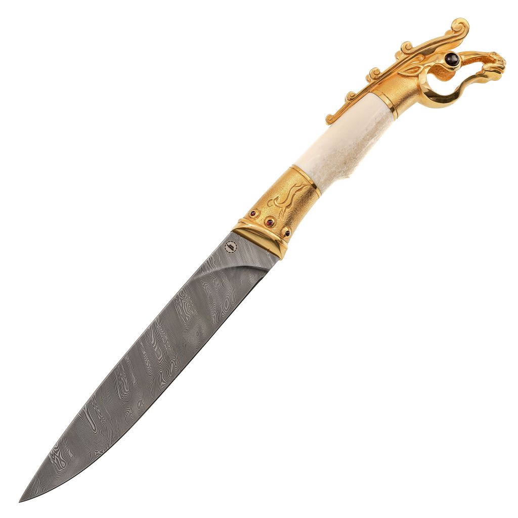 Подарочный нож Олень. Коллекция «Скифы», дамасская сталь с никелем, рукоять моржовый клык, гранат