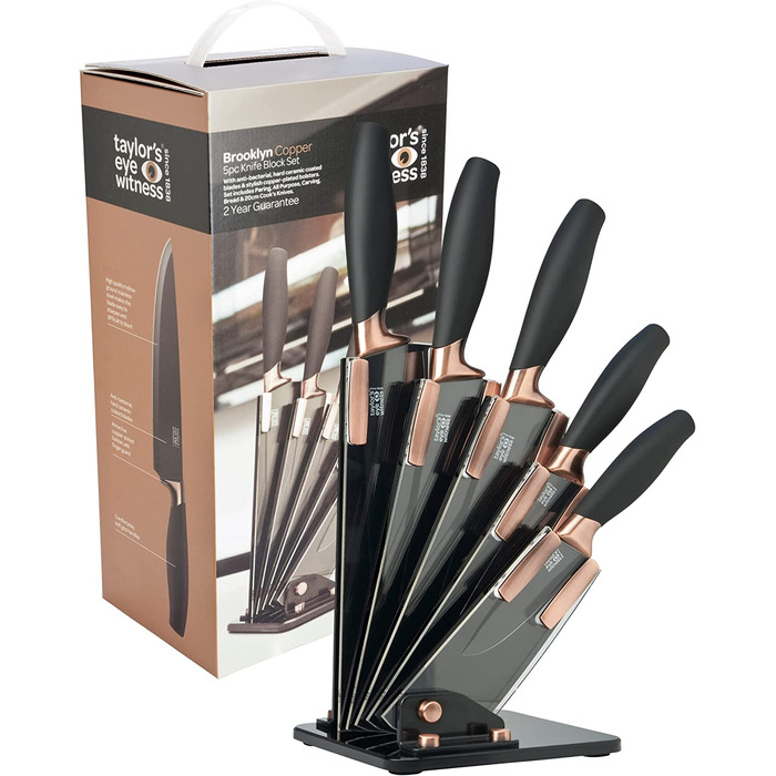 Набор ножей Brooklyn Copper Series от Taylor's Eye Witness – это сочетание стильного дизайна и высокой функциональности. Комплект из пяти ножей с подставкой станет не только практичным инструментом, но и элегантным украшением вашей кухни.