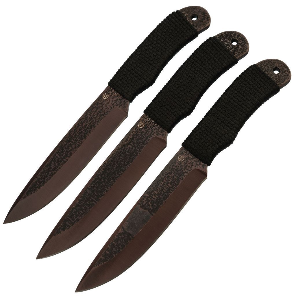 В набор входит три сбалансированных ножа из рессорной стали 65Г, которая имеет чрезвычайную ударную вязкость и стойкость к боковым нагрузкам. Это нужно для того, что бы нож не раскололся от нагрузок при попадании в мишень.Рукояти ножей для улучшения комфорта при использовании обмотаны синтетическим шнуром.В набор также входит чехол на три ножа, выполненный из плотной, но гибкой кордуры. Имеется возможность подвеса на пояс.Теперь обучение пойдет гораздо быстрее, вы сможете делать сеты по три броска и в процессе тренировки корректировать и улучшать результаты.
