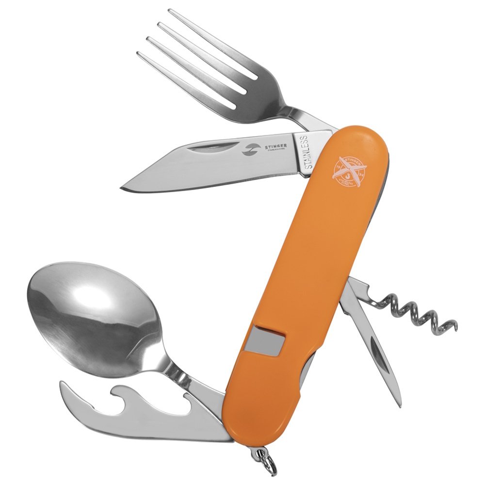 Нож перочинный STINGER имеет 8 функций:1. Лезвие2. Ложка3. Вилка4. Открывалка для бутылок5. Консервный нож6. Ледокол7. Штопор8. Кольцо для ключей