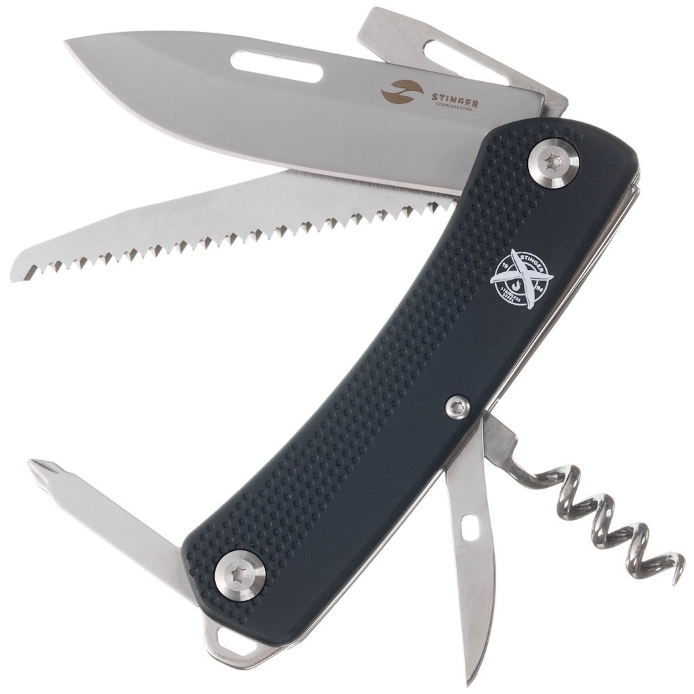 Нож перочинный STINGER имеет 10 функций:1. Лезвие2. Пила по дереву3. Открывалка для бутылок с:4. – Отверткой5. – Инструментом для снятия изоляции6. Штопор7. Шило с:8. – Иглой9. Крестовая отвертка10. Держатель для ключей