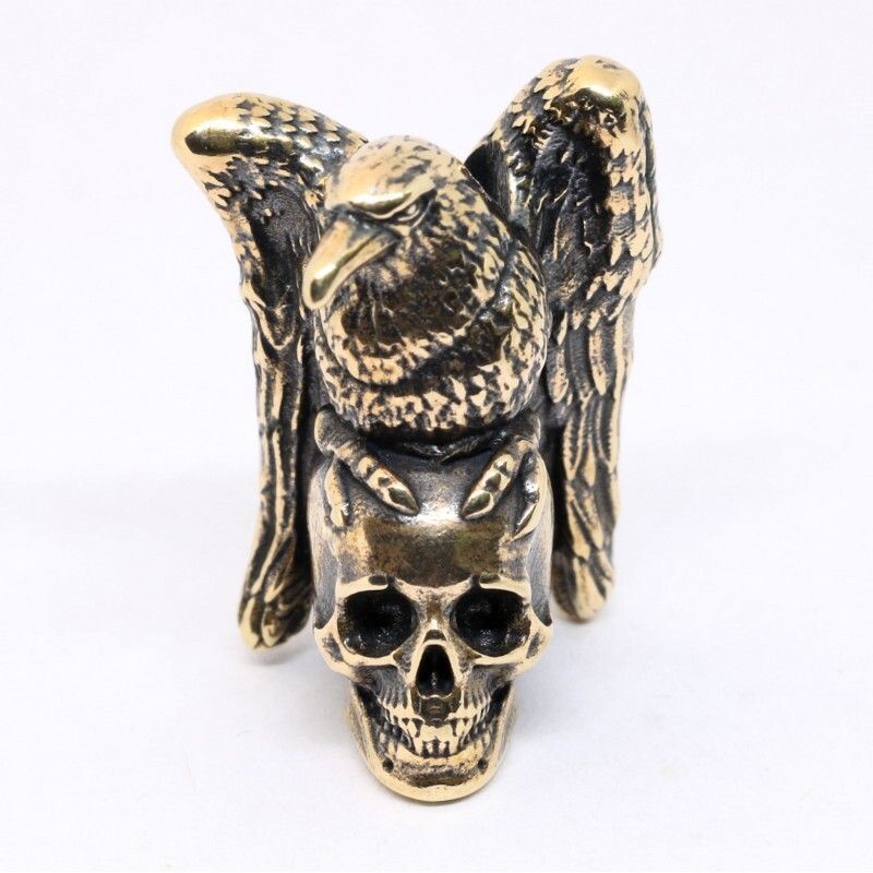 Бусина «Ворон с черепом» от Рязанской Литейной мастерской напоминает о готической эстетике, сочетая символику и атмосферу мрака. Изображённый ворон, сидящий на черепе, вызывает ассоциации с мрачной атмосферой и мифами, связанными с этим птицем.
