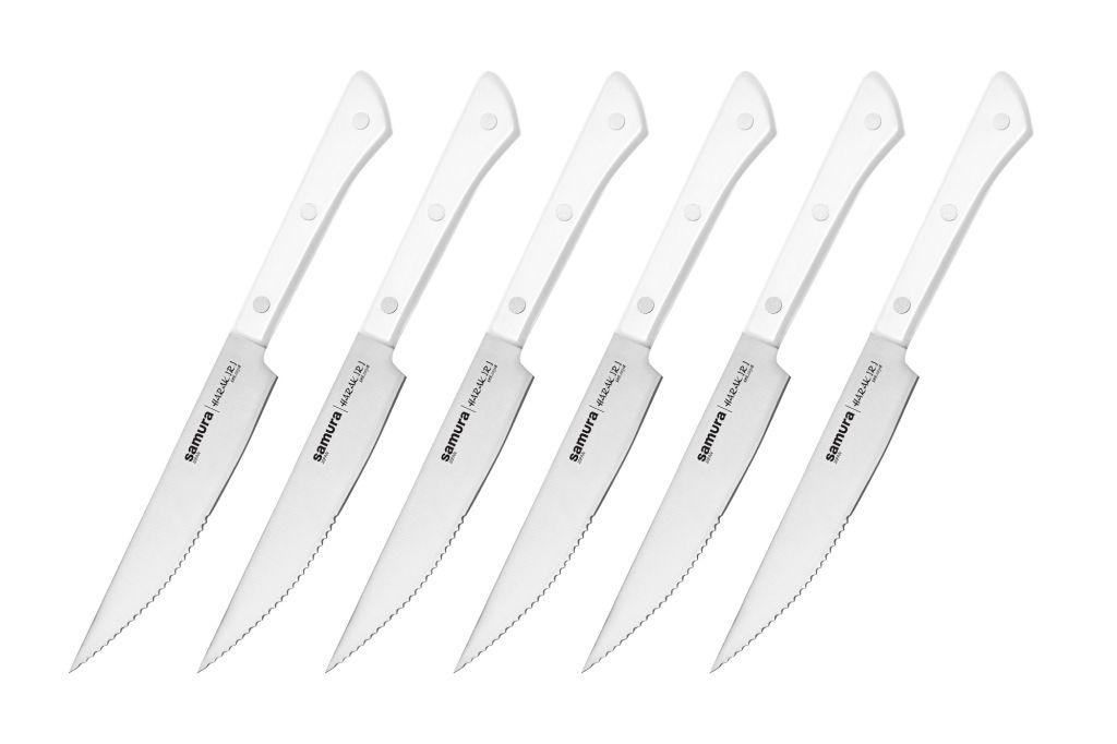 Стейковые ножи предназначены специально для нарезки стейков. Они имеют серрейторную заточку, которая идеально подходит для резки волокнистых продуктов, таких как мясо. Благодаря этой особенности ножи легко справляются с задачей нарезки даже на тарелке, чего не стоит сделать с обычной "plain" заточкой. Нержавеющая сталь AUS-8, используемая для изготовления клинков ножей, обладает рядом превосходных качеств. Ее высокая устойчивость к коррозии делает ее идеальным выбором для кухонных ножей, подверженных воздействию влаги и пищевых кислот. Кроме того, эта сталь легко затачивается до бритвенной остроты без особых усилий. Благодаря этим свойствам нож с клинком из AUS-8 не требует сложного ухода и сохраняет свою функциональность на протяжении долгого времени.Пластиковые рукоятки кухонных ножей обладают рядом преимуществ, которые делают их заслуживающими внимания. Легкий вес позволяет комфортно работать с ножом длительное время без усталости. Прочный материал обеспечивает долгий срок службы изделия, не требуя постоянного ухода или специального хранения. Неприхотливость пластика делает его идеальным выбором для кухонных условий, где часто встречается высокая влажность и контакт с различными продуктами. Благодаря этим свойствам пластиковая ручка становится оптимальным выбором для профессиональных или повседневных задач на кухне.Набор поставляется в блистере.