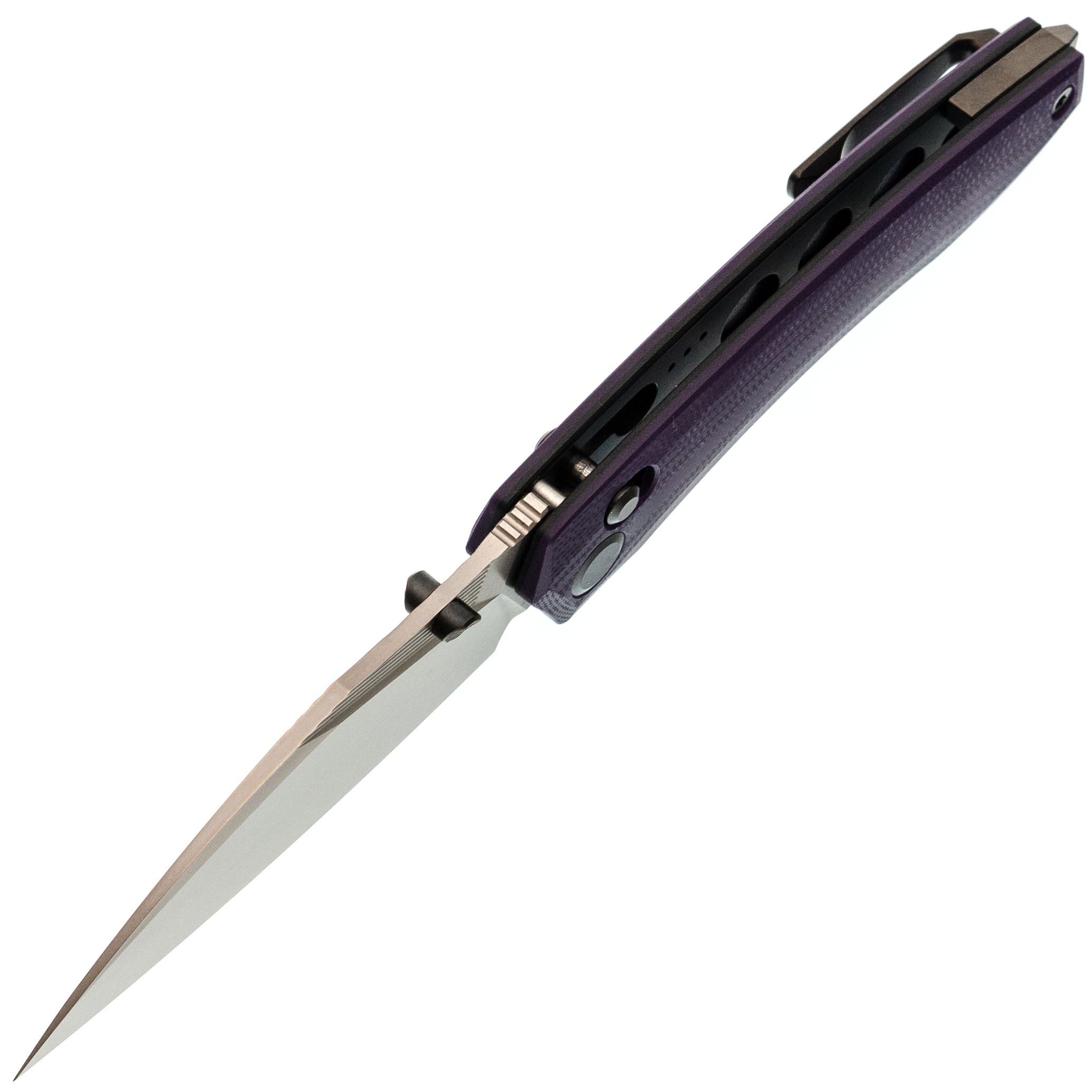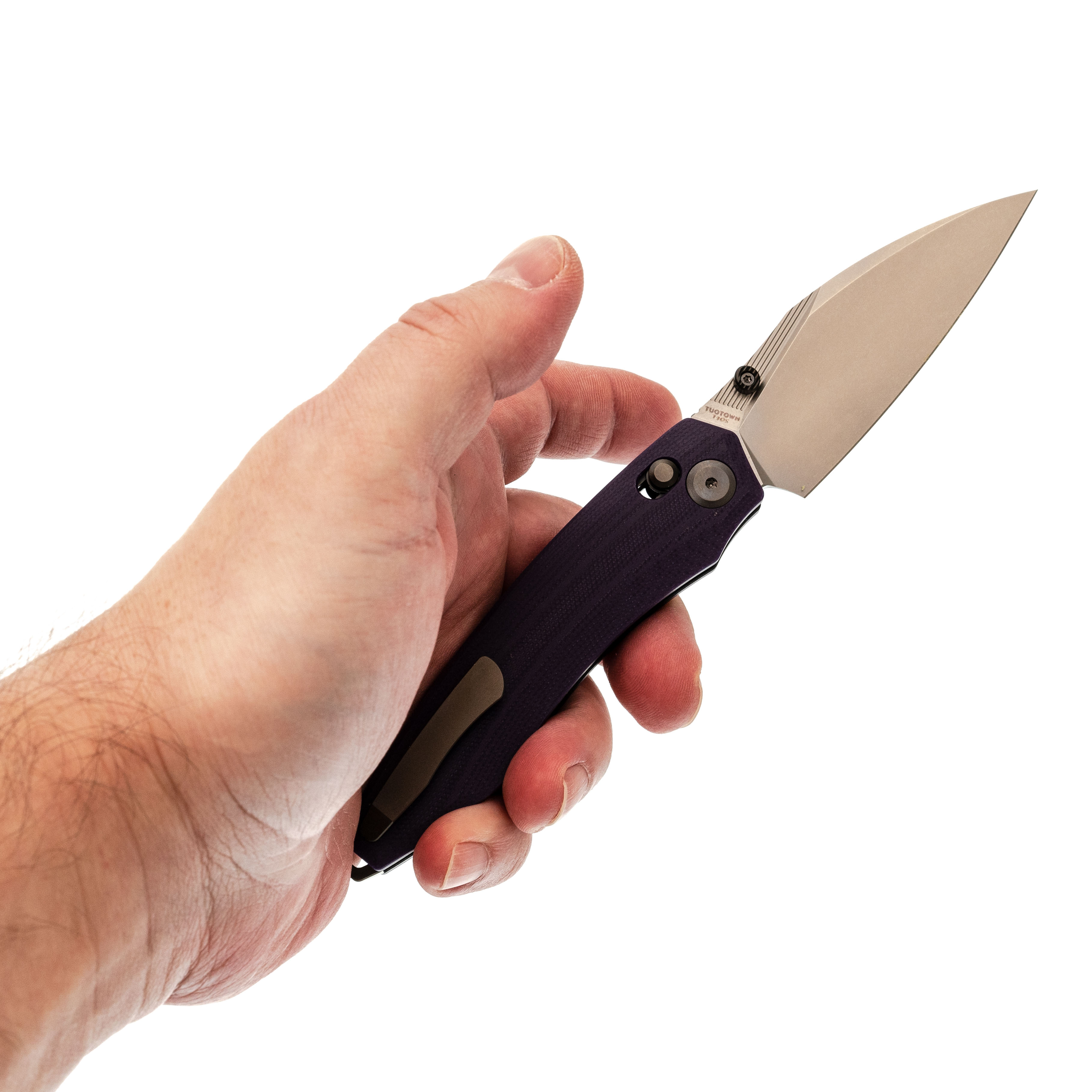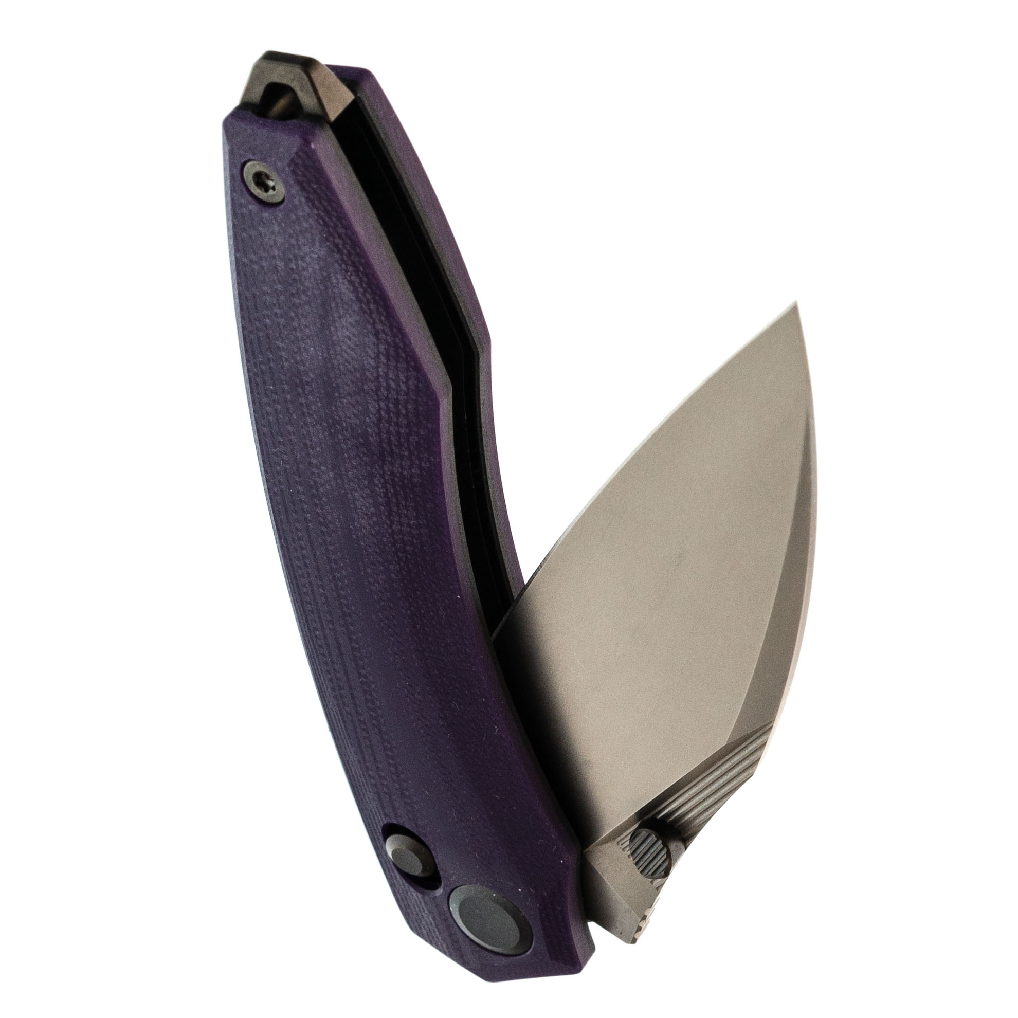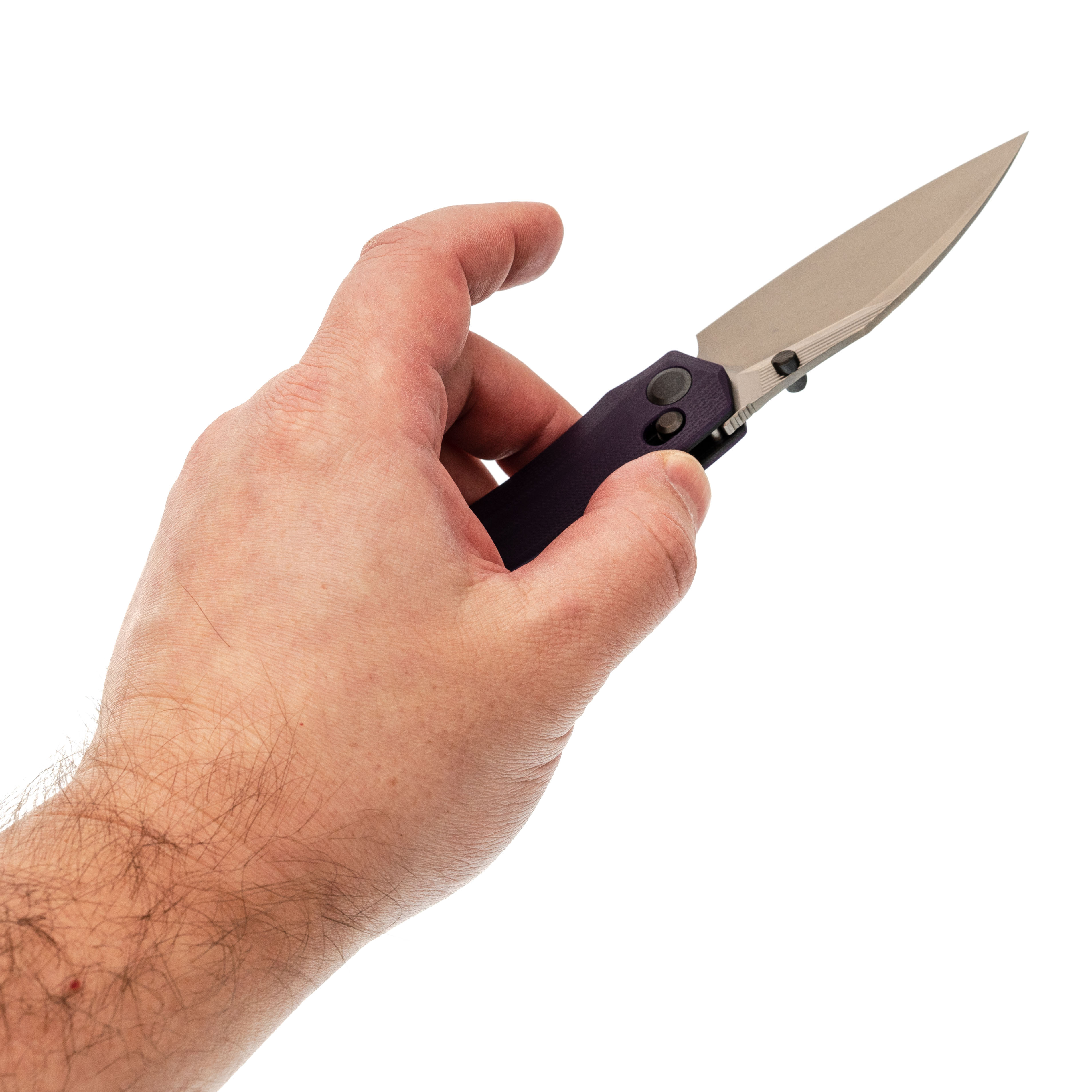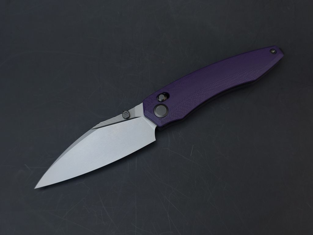 Рукоять нейтральной формы подойдёт для разных ладоней и не диктует жёсткую постановку пальцев. Фиолетовый G10 добавляет характер, но не выглядит вызывающе. Замок Crossbar-Lock удобен тем, что:
