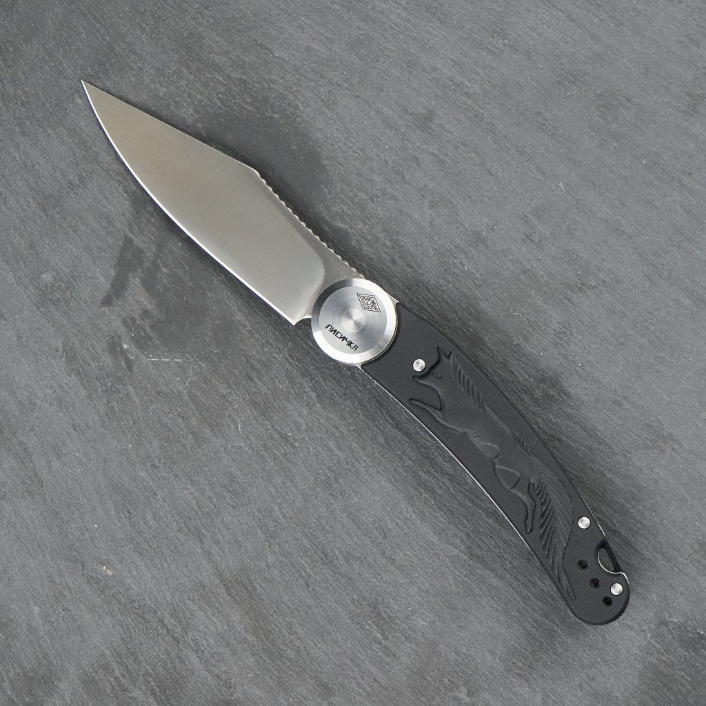 Конструкция рукояти у Лисички необычная. Она размыкается на две половины и вращается вокруг оси, фиксируясь штифтом в открытом и закрытом положении. Это так называемый рамочный замок, который делает конструкцию максимально жесткой. В открытом положении нож ощущается как фикс - никаких люфтов и шатаний. Закрывается он плотно и случайно открыться в кармане просто не сможет. Да, чтобы привести нож в рабочее положение, понадобятся две руки, и делает он это не быстро. Но для спокойных повседневных задач это не минус, а сознательная плата за абсолютную надежность и безопасность. На черных накладках из FRN красуется изображение лисицы - именно этот рисунок дал ножу имя и делает его узнаваемым.