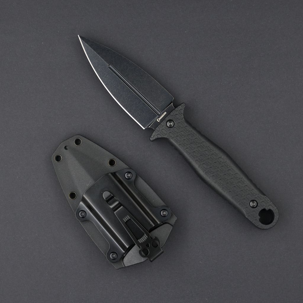 Нож Daggerr Combat из серии Discover Line является компактным кинжалом, разработанным для использования в тактических и городских условиях. Линейка сочетает в себе доступность и качественное исполнение.Клинок изготовлен из стали 8Cr14MoV – нержавеющей стали, которая отличается высокой ударной вязкостью, устойчивостью к коррозии и легкостью заточки. Его кинжальный профиль обеспечивает проникающую способность, а деликатный кончик подходит для точных надрезов. Покрытие клинка Black Stonewash повышает коррозионную стойкость и устраняет блики.Рукоять выполнена из термопластика FRN, что обеспечивает ей прочность и легкость при эксплуатации. Благодаря всадному монтажу нож получает оптимальный баланс между весом и надёжностью, а съёмная конструкция облегчает обслуживание. Присутствует крупное темлячное отверстие, форма которого напоминает череп и является особенностью DaggerrНожны изготовлены из пластика, что обеспечивает их высокую устойчивость к условиям окружающей среды в любое время года. Фирменная клипса Dagger с изображением черепа позволяет удобно носить нож в кармане или на ремне. Наличие люверсов обеспечивает возможность крепления различных систем.