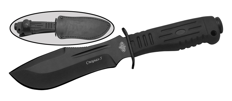 Клинок Спецназ-5 выполнен с постепенным расширением от узкой пяты к массивному острию. Это решение обеспечивает смещённый баланс вперёд, что делает нож эффективным не только для реза, но и для лёгких рубящих ударов.