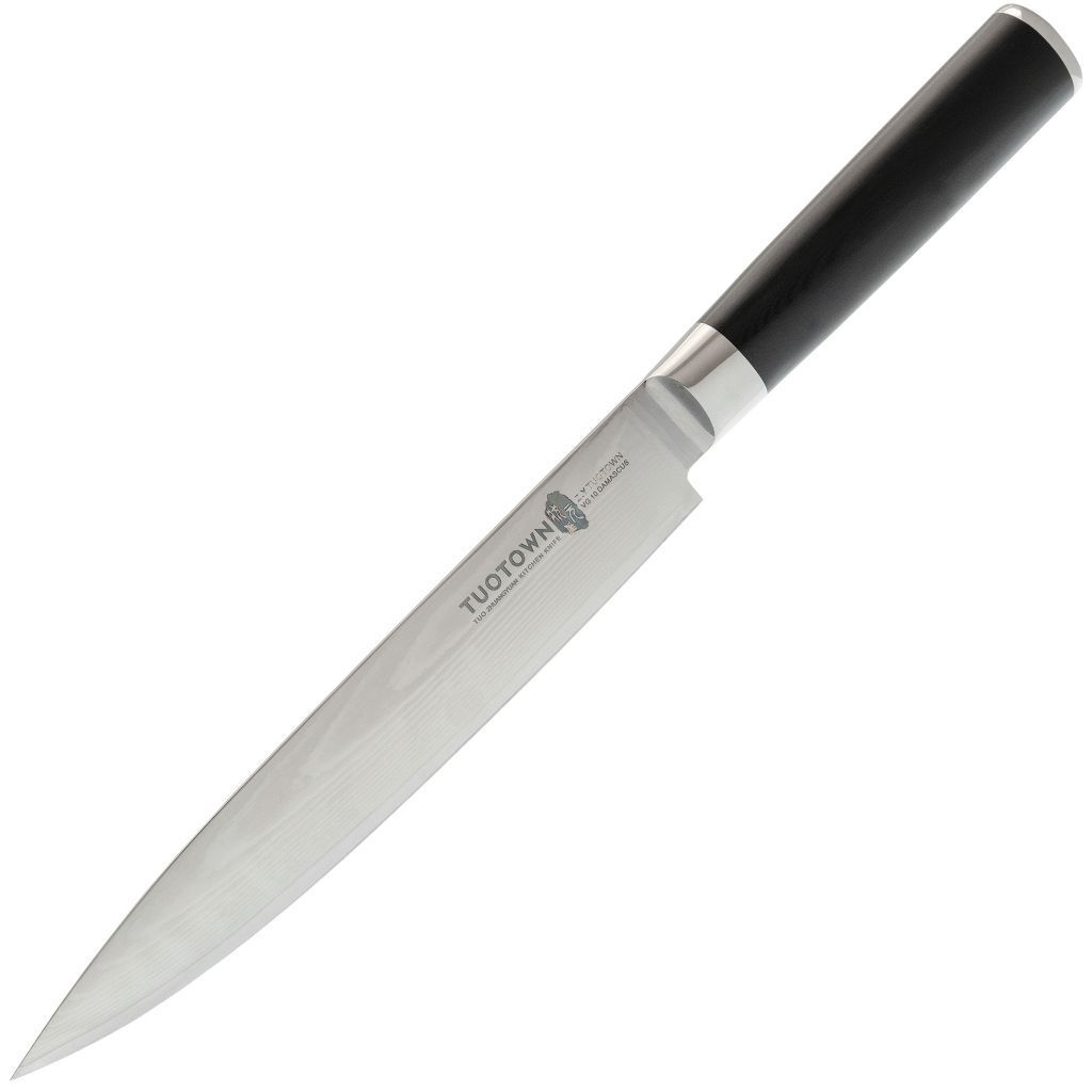 Этот кухонный нож от TuoTown станет незаменимым помощником для любого гурмана и шеф-повара. Его тонкий и изящный клинок, изготовленный из премиальной стали VG-10, идеально подходит для нарезки различных продуктов с максимальной точностью.Высокое качество стали VG-10 гарантирует исключительную остроту режущей кромки, что позволяет легко и быстро нарезать тонкие ломтики колбасы, сыра или фруктов, таких как цитрусовые. Благодаря узкой форме ножа вы сможете делать ровные и аккуратные срезы, обеспечивая идеальное представление блюд.Дополнительная особенность ножа - его ламинированный клинок. Обкладки из дамаска не только придают ножу эстетичный внешний вид, но и усиливают его характеристики. Ламинация обеспечивает оптимальное сочетание прочности и гибкости, что важно при работе с различными продуктами.Рукоять из стеклотекстолита G10 обеспечивает надежный и комфортный хват, позволяя уверенно и безопасно работать с ножом. Этот материал отличается прочностью и стойкостью к воздействию влаги, что делает рукоять практичной и долговечной.Идеально подходя для нарезки ингредиентов, этот нож станет незаменимым инструментом для создания изысканных закусок, салатов или украшения блюд. Он позволит вам с легкостью подготовить продукты для праздничного стола или повседневного рациона, обеспечивая точность и красоту нарезки.