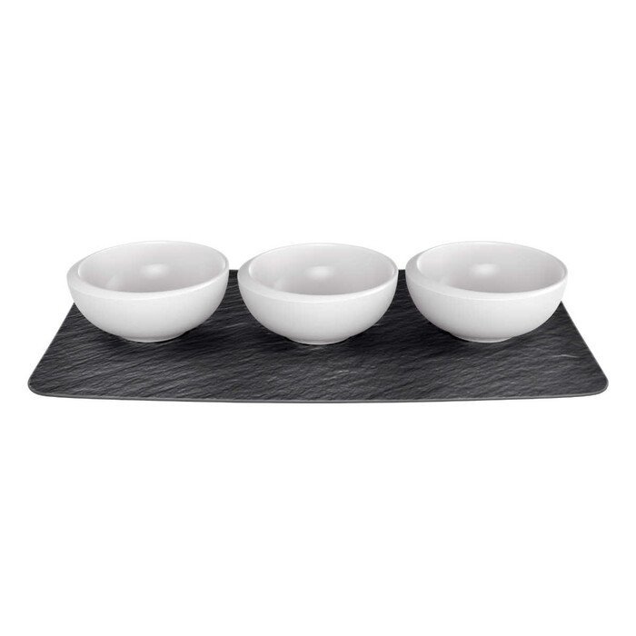 Выразительный, функциональный, пуристический - все это относится к коллекции NewMoon от Villeroy & Boch. Дизайн посуды вдохновлен фазами луны, повторяя четкость линий, небольшую ассиметрию. Глянцевый блеск сочетается с оригинальностью фактуры, создавая потрясающий и внеземной внешний вид коллекции. Стильный ободок в форме узкого полумесяца и небольшая асимметрия отражают четкий характер коллекции. Изделия характеризуются инновационным, сильно осязательным дизайном. Набор состоит из трех чаш и прямоугольной тарелки из сланца из серии Manfucture Rock. Вы можете использовать тарелку как подставку для пиал или самостоятельно для сервировки. Откройте для себя прекрасную коллекцию, которая была вдохновлена фазами луны. Изделие подходит для микроволновой печи и посудомоечной машини.