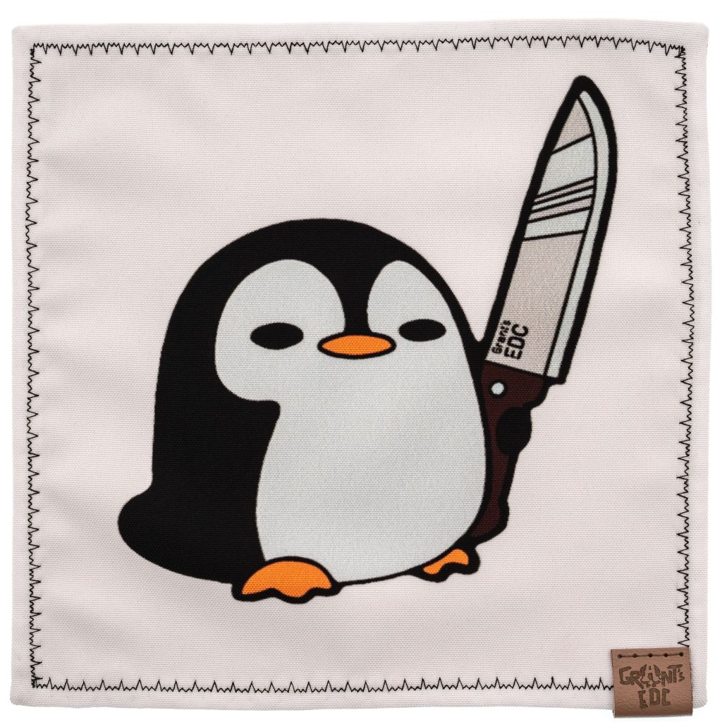 Хэнк - это сокращение от английского handkerchief (по-нашему носовой платок), но здесь он играет совсем другую роль: аккуратный аксессуар для EDC-рутины. На лицевой стороне - милый пингвинчик с большим ножом, который будто говорит: Спокойно, я всё протру и красиво подам. Дизайн яркий, но не кричащий, поэтому хэнк отлично смотрится и в кадре, и на столе.