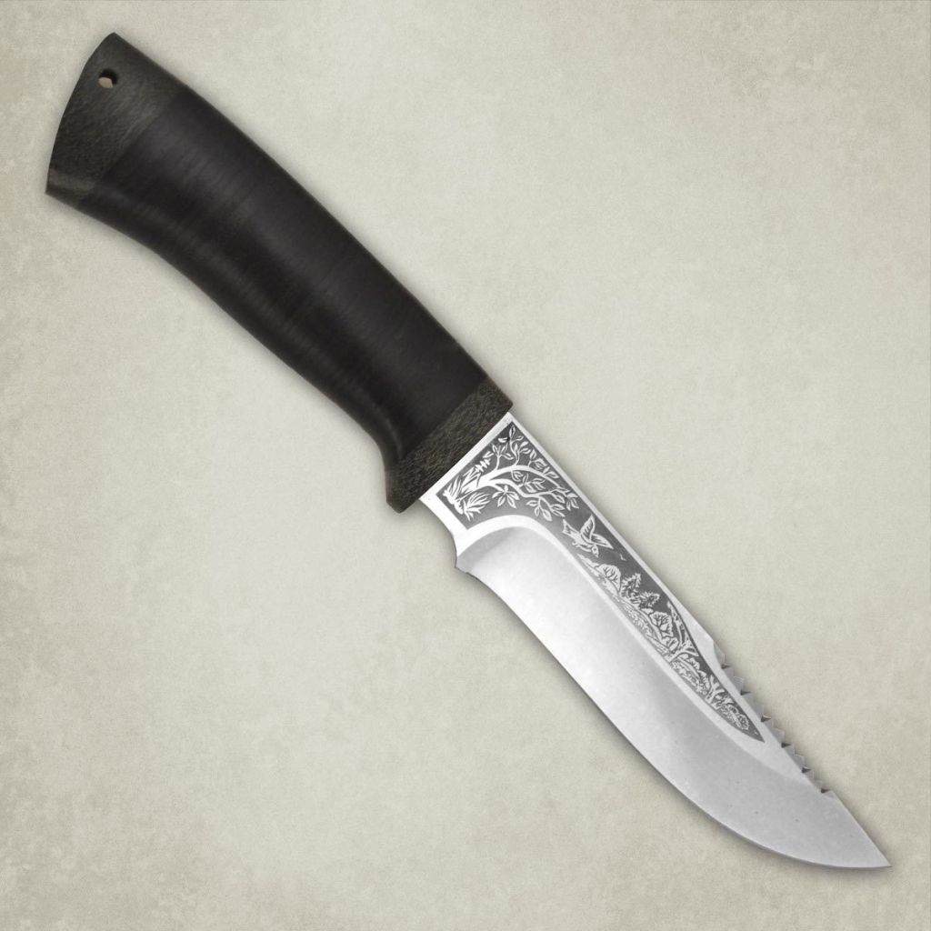 Солидный универсальный, легкий и прочный нож с клинком классической формы, имеющим широкие вогнутые линзовидные спуски, образующие тонкое, прекрасно режущее лезвие. Демонстрирует отличные режущие качества. Поэтому в умелых руках становится весьма серьезным инструментом. Клинок с толщиной обуха в 2,4 мм имеет полноценную голомень, что придает ему дополнительную прочность. На нешироком фальшлезвии нанесена небольшая пилообразная заточка, которая позволяет надпиливать кости, хрящи или чистить чешую пойманной рыбы. Классическая форма рукояти подкупает: она удобна даже для большой руки, уверенно и прочно ложится в любую ладонь. А оптимальной величины гарда не дает соскользнуть пальцам при резах от себя. Монтаж клинка сквозной, неразборный. Отличный выбор для большинства видов работы в лесу. Имеет солидный отряд почитателей.