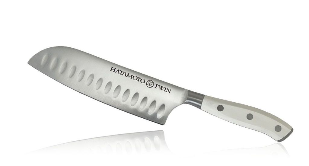 Сантоку Hatamoto — это привлекательный инструмент, сочетающий в себе черты японских и европейских кухонных ножей. Формат ножа выполнен в японском стиле, в то время как рукоять имеет европейский дизайн. Сантоку является универсальным помощником на кухне, он выполняет функции традиционного ножа-шефа.Клинок широкий с прямыми спусками и тонким обухом, что обеспечивает невероятно плавный и чистый рез. На поверхности клинка расположены воздушные карманы, которые предотвращают прилипание продуктов к лезвию. Клинок выполнен из стали AUS-8, главными достоинствами которой являются устойчивостью к коррозии и легкостью заточки.Рукоять изготовлена из водостойкого пластика, что гарантирует комфортное и безопасное использование. Плавный переход больстера в клинок обеспечивает удобство поварского хвата и гарантирует максимальную гигиеничность. Модель идеально сбалансирована, что позволяет легко и точно контролировать движения при резе.