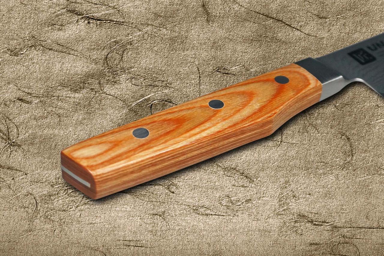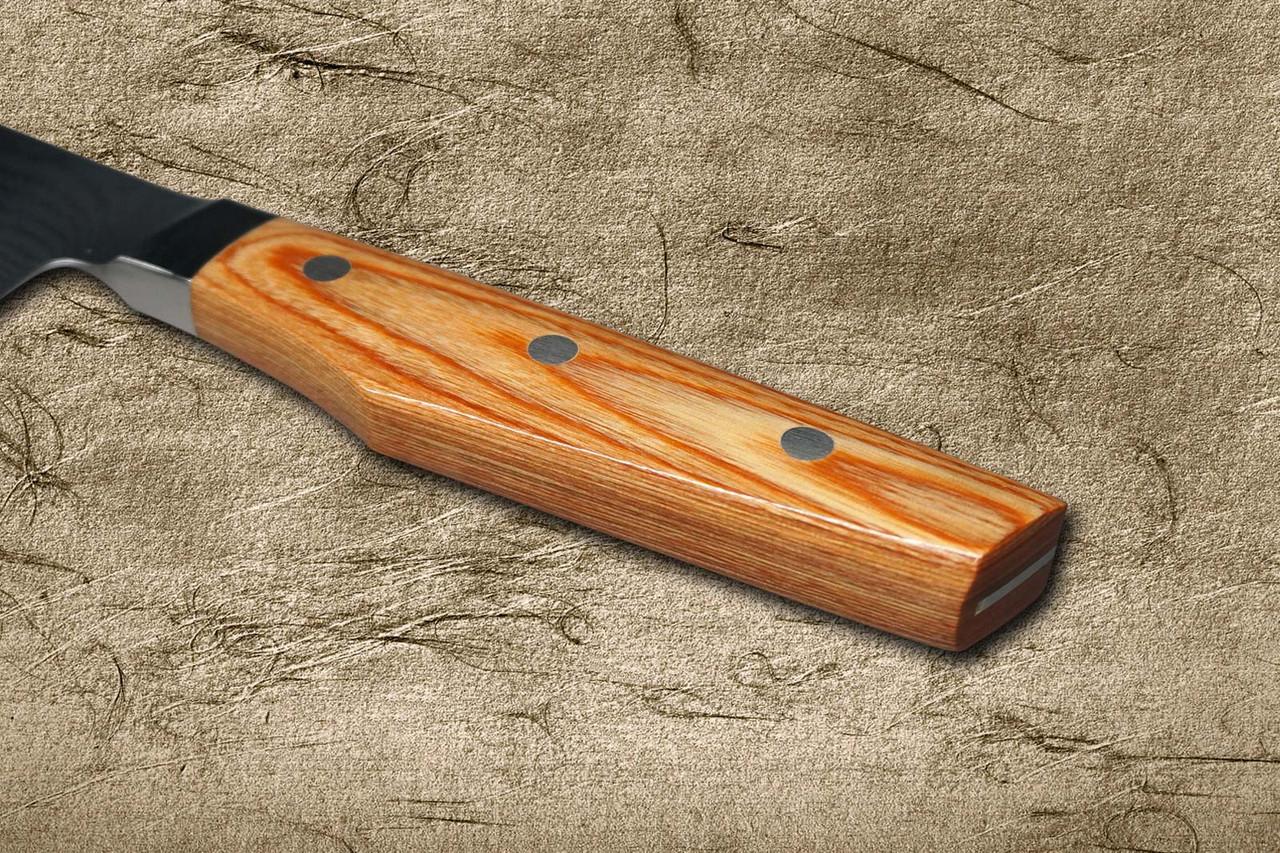 Дамасские обкладки - многослойный металл по сторонам сердечника добавляет клинку устойчивость к нагрузкам и даёт характерный волнистый рисунок, который ассоциируется с традиционными японскими кухонниками.