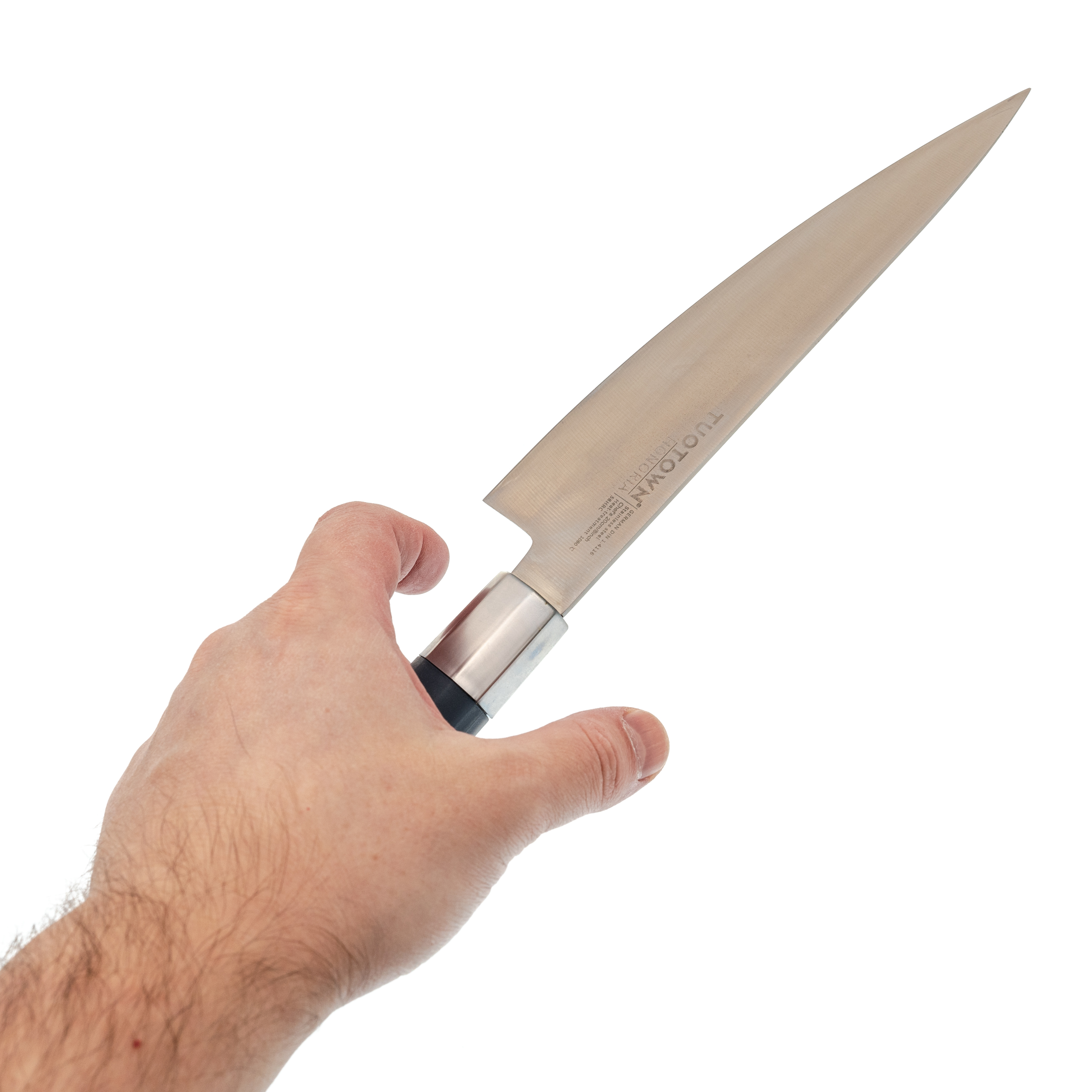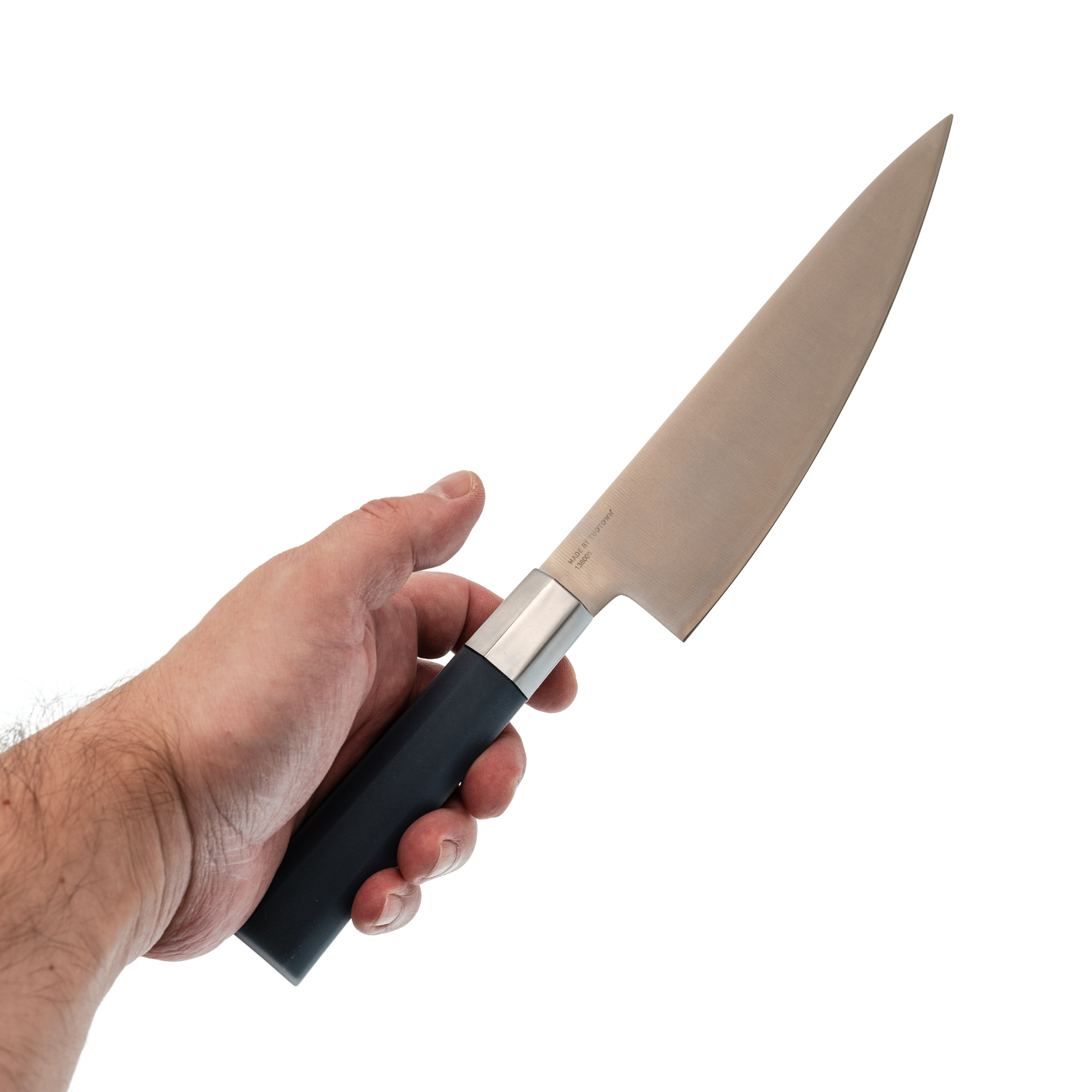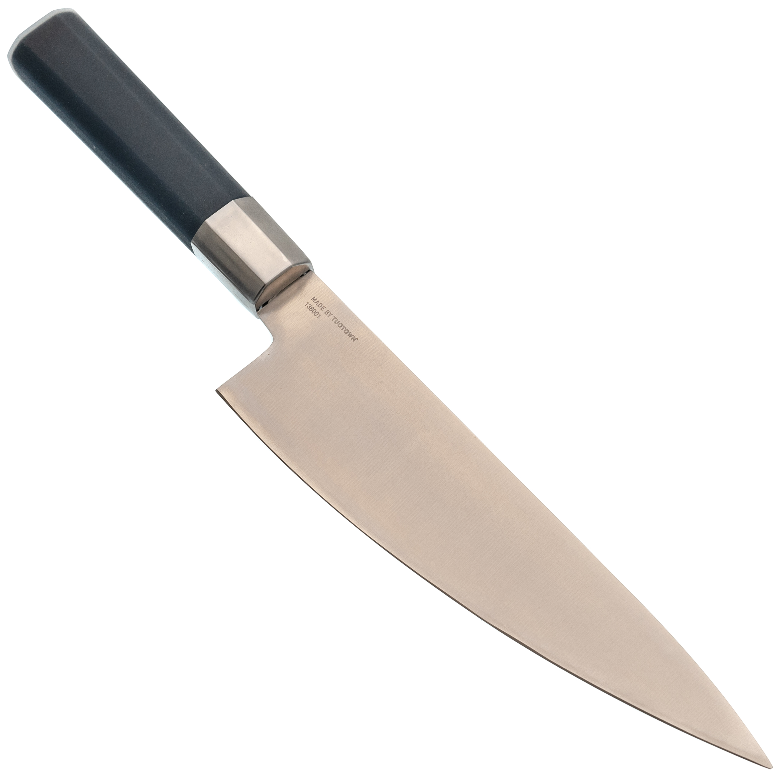 Восьмигранная рукоять удобно ложится в ладонь и подходит для разных размеров руки. Она равномерно распределяет нагрузку и помогает сохранять контроль над ножом. В результате шеф комфортен и для коротких задач, и для долгой кухонной сессии.