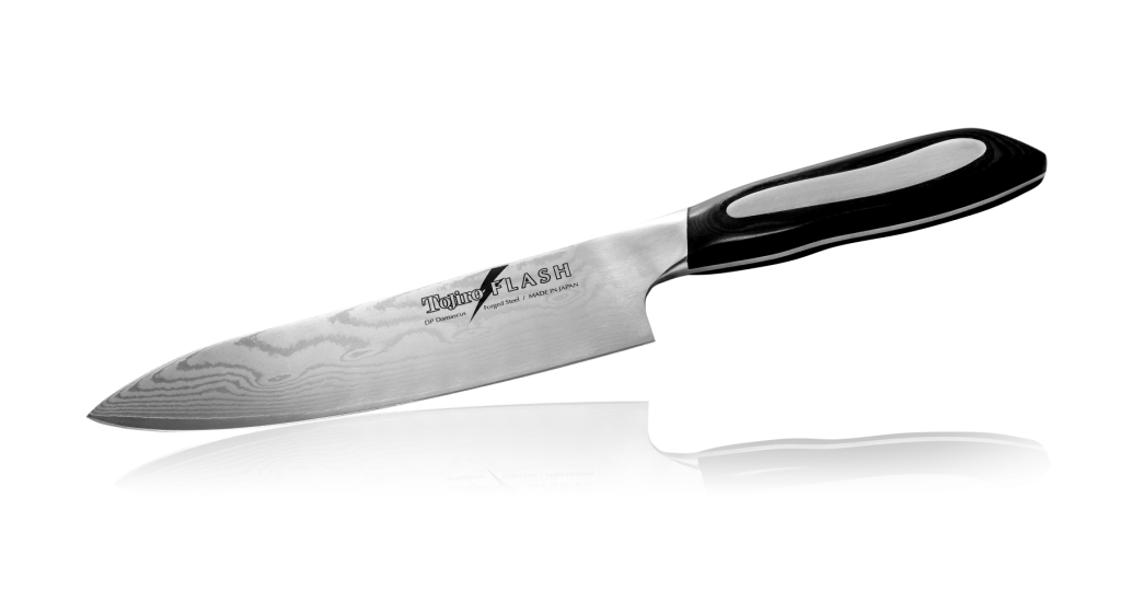 Tojiro Flash - это премиальный японский шеф-нож, который сочетает в себе традиции Японии и Европы. Его форма и общее строение навеяны европейскими ножами, но при этом он изготовлен с соблюдением всех японских традиций.Клинок изготовлен из ламината, состоящего из сердечника VG-10, расположенного между двумя обкладками из дамаска. Такое сочетание материалов придает клинку благородный внешний вид и обеспечивает превосходные характеристики режущей кромки. Благодаря ламинатной структуре, сердечник VG-10 может быть лучше закален, что позволяет держать заточку в течение длительного периода времени. Несмотря на европейское влияние на дизайн, шеф сохранил японскую традицию малой толщины и деликатного сведения, что обеспечивает бесперебойную и точную работу.Рукоять Tojiro Flash изготовлена из микарты - прочного и водостойкого материала, который часто используется в ножевом производстве. Рукоять имеет небольшой изгиб, что обеспечивает комфортную и безопасную работу.