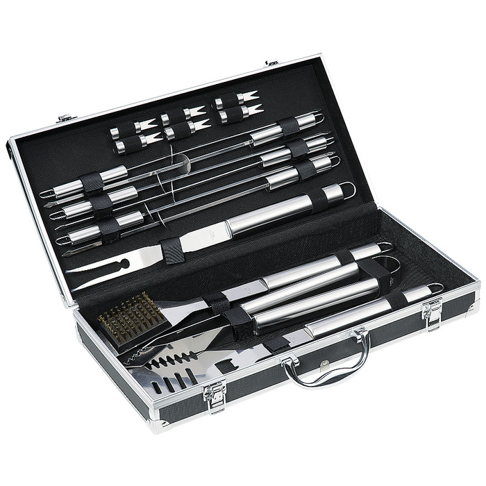 Набор для барбекю ARIZONA качественный и функциональный. Все приспособления изготовлены из нержавеющей стали, устойчивой к ржавчине, аккуратно размещены в стильном черном кейсе из алюминия. Отличный вариант для дороги и кемпинга!