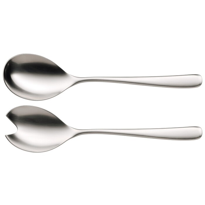 Приборы для салата идеально подходят как для подачи салата, так и для различных изделий из теста. Имеют длинные ручки, что предотвращает соскальзывание приборов в миску при перемешивании. Набор для салата состоит из двух предметов - одной полноценной ложки и ложки с вырезом для того, чтобы соус при сервировке мог стекать, оставаясь в миске. Ко всем сериям столовых приборов компании WMF имеются подходящие приборы для салата.
