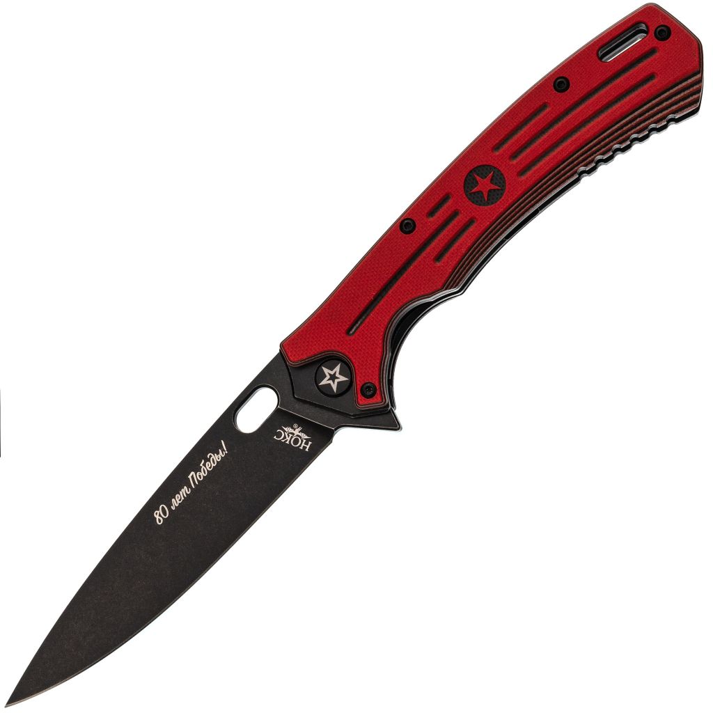 Общее описаниеНож НОКС Майор – крупный универсальный складной нож отечественного производства, предназначенный для использования в походах и повседневной жизни. Изделие объединяет продуманный дизайн с высококачественными материалами, что гарантирует его надежность в любых условиях. Выпуск модели приурочен к 80-летию со дня Победы в Великой Отечественной войне, что придает ей особую ценность и памятное значение. Нож поставляется в подарочной коробке.КлинокКлинок изготовлен из стали VG-10, известной своей долговечностью и стабильностью при различных эксплуатационных нагрузках. Профиль Drop-Point с прямыми спусками от обуха обеспечивает равномерное распределение усилий при резке и строгании. Открытие клинка осуществляется посредством отверстия и плавника. Поверхность обработана технологией Black Stonewash, повышающей коррозионную стойкость и устраняющей блики, а также дополнена специальной гравировкой, поздравляющей с 80-летней годовщиной Победы.РукоятьРукоять выполнена из материала G10 с многослойной структурой, что обеспечивает дополнительную прочность и долговечность. Изделие отличается ярким красным цветом рукояти, который гармонично сочетается с общим дизайном ножа. Эргономичная форма с глубокой подпальцевой выемкой гарантирует удобное и безопасное использование в любых условиях. Механизм фиксации клинка реализован через замок Liner-Lock, надежно удерживающий клинок в открытом положении.