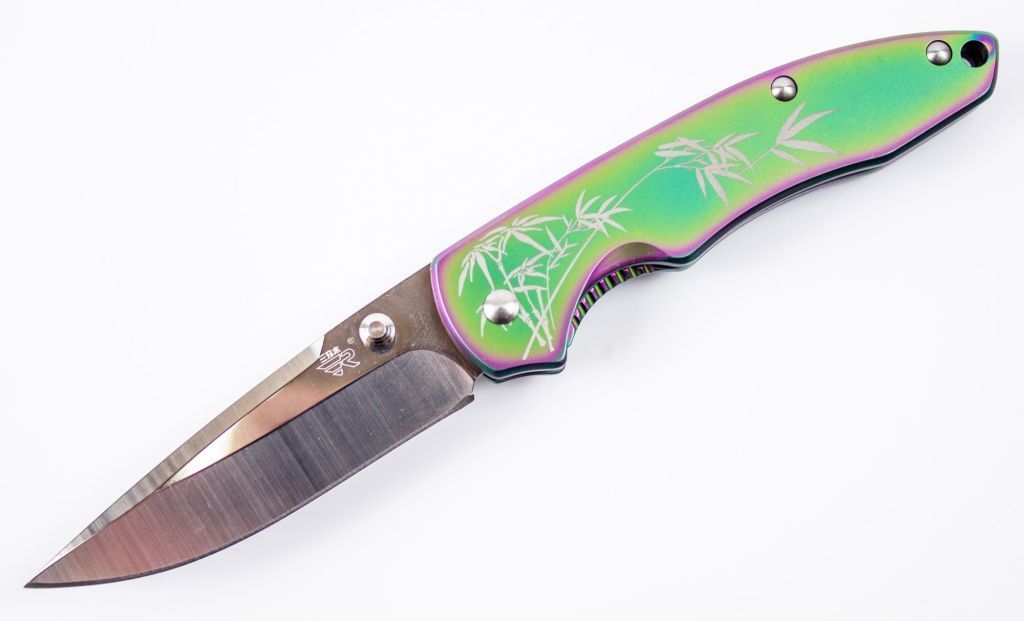 Рукоять ножа выполнена из нержавеющей стали, что обеспечивает ей высокую прочность и делает нож ощутимым в руке благодаря приятному весу. Особое внимание привлекает градиентное покрытие и гравировка с изображением бамбука, которая символизирует гибкость, стойкость и благополучие в восточной культуре. Замок Frame-Lock отвечает за высокую надёжность и прочность фиксации клинка в открытом положении. Также на рукояти предусмотрено отверстие для темляка, что позволяет украсить нож по своему вкусу и повысить удобство использования.