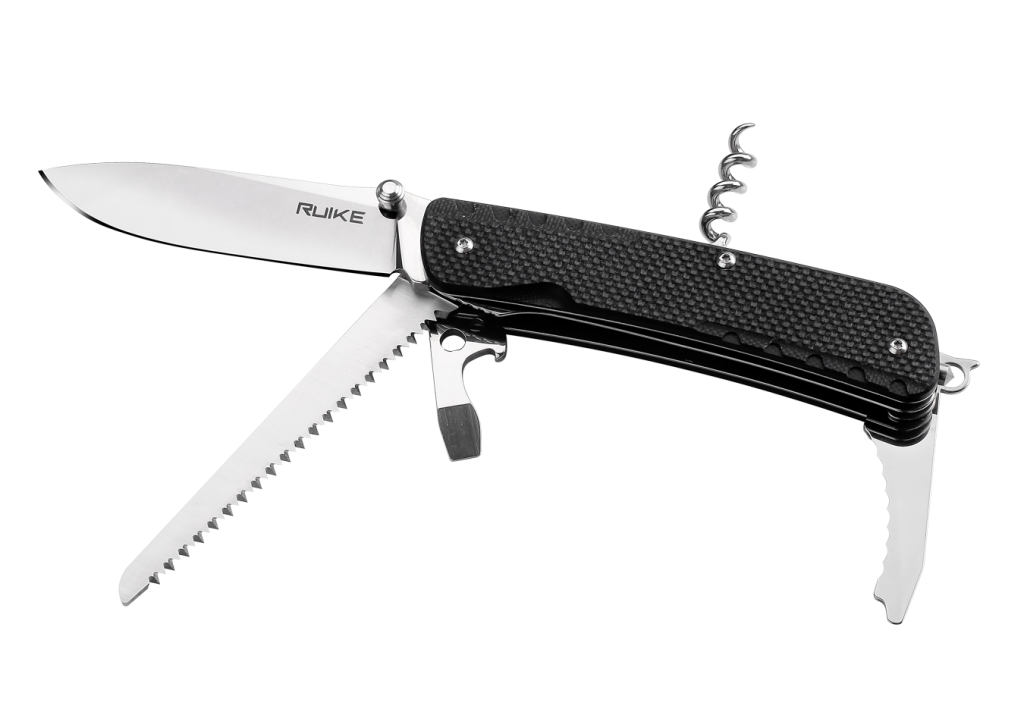 Складной нож Ruike LD32-B способен заменить сразу несколько инструментов и очень удобен для карманной носки. Практичная конструкция пригодится на природе или во время ремонта, когда нужной отвертки под рукой не оказалось.Складной нож со штопором и открывалкой включает в себя стеклобой, пилу для резьбы по дереву и прочие приспособления и инструменты. Клинок прекрасно справляется с твердыми волокнистыми материалами. Для изготовления клинка и инструментов использовалась шведская сталь Sandvik 12C27. Металл устойчив к коррозии но надолго оставлять лезвие в воде не стоит. Фиксацию ножа обеспечивает система Liner-Lock. Для закрытия необходимо надавить на пластину под лезвием. Накладки на ручке изготовлены из стойкого к выгоранию и воздействию высоких и низких температур композитного материала G10.С помощью клипсы удобно крепить мультитул на ремень или карман.