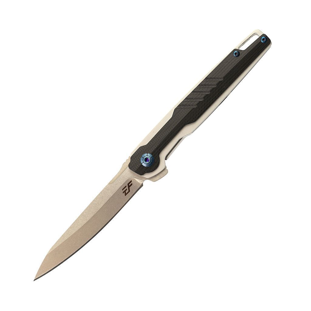СКЛАДНОЙ НОЖ EAFENGROW EF942, СТАЛЬ D2, РУКОЯТЬ G10 это трендовая вещица, которая не оставит равнодушным ни одного ценителя ножевой тематики. Особенно удачным получился форм-фактор ножа щепки - он будет удобен и незаметен в ношении, оставаясь элегантно футуристичным.Нож сочетает в себе несколько элементов, которые помогут ему попасть в список ваших ножевых хотелок. Одним из которых является клинок, выполненный из хорошо известной ножеманам стали D2, которая представляет собой оптимальный вариант для городского использования - она долго держит заточку и имеет агрессивный рез. Форма клинка Reverse-Tanto обеспечивает ножу деликатный кончик, которым удобно делать аккуратные надрезы.Отдельно стоит отметить сочетание цветов, которое сразу показывает что дизайнеры бренда точно отслеживают все самые популярные тенденции. Матовый серый цвет клинка гармонично сочетается с черной рифленой поверхностью накладок из G10. Дополняют композицию яркие цветовые акценты в виде винтов ярко синего цвета. Комбинация стали и стеклотекстолита G10 в конструкции ножа обеспечивает высочайшую прочность и устойчивость к различным воздействиям окружающей среды. Независимо от того, где вы находитесь или что делаете - этот нож будет всегда готов помочь вам справиться с любыми задачами без потери своих качественных характеристик.В тыльной части располагается фигурное отверстие для темляка или страховочной петли.