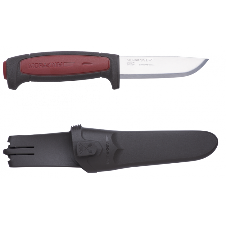 Нож Morakniv Pro C, углеродистая сталь относится к нескладному типу ножей. Его лезвие с прямой заточкой имеет форму drop-point. Благодаря этому многоцелевой нож Mora Pro C может одинаково хорошо резать и колоть. Высокая ударопрочность и износостойкость достигается благодаря сплаву нержавеющей стали с углеродом. Такой состав рекомендуется вытирать насухо после использования во влажных условиях. Рукоять выполнена из пластика необычного красного цвета, для лучшей фиксации в руке поверх пластика находятся резиновые накладки, увеличивающие трение. Нож укомплектован надежными пластиковыми ножнами с возможностью крепления на поясе.