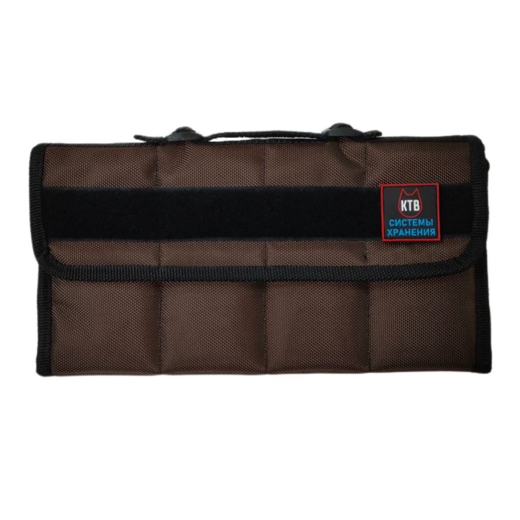 Коричневая сумка KTB - это практичный аксессуар для бережного хранения восьми складных ножей или небольших фиксов. Стильный, сдержанный внешний вид делает её уместной как на полке коллекционера, так и в повседневном использовании.