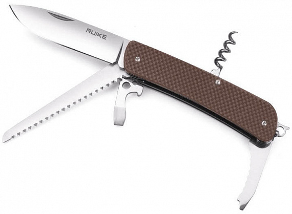 Нож (длинное лезвие, пила по дереву, инструмент для закручивания проволоки, открывалка для бутылок, большая отвертка 6,5 мм, инструмент для оголения провода, стропорез, малая отвертка 3 мм, карманная клипса, штопор, стеклобой, кольцо для ключей/темляка, пинцет)