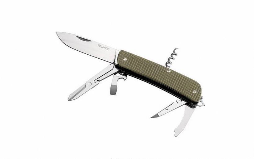 Нож (длинное лезвие, ножницы, инструмент для закручивания проволоки, открывалка для бутылок, большая отвертка 6,5 мм, инструмент для оголения провода, пила по дереву, инструмент для работы с проводом, ключ для велосипедных спиц, отверстие для нитки, скальпель, шило, стропорез, малая отвертка 3 мм, карманная клипса, штопор, стеклобой, кольцо для ключей/темляка, пинцет)