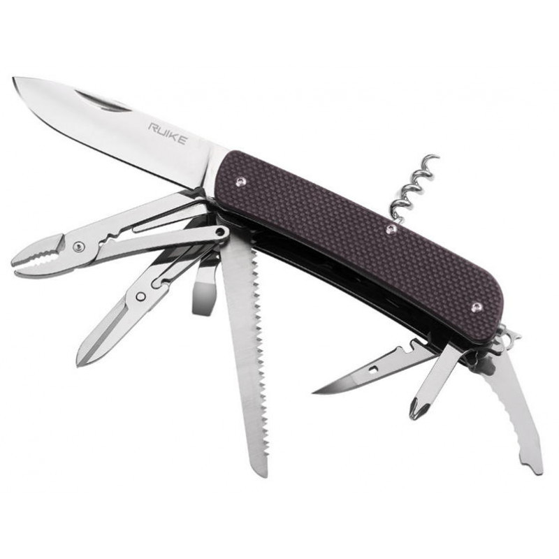 Нож (длинное лезвие, плоскогубцы, кусачки для проволоки, плоскогубцы для лески, ножницы, инструмент для закручивания проволоки, открывалка для бутылок, большая отвертка 6,5 мм, инструмент для оголения провода, пила по дереву, скальпель, шило, инструмент для работы с проводом, ключ для велосипедных спиц, отверстие для продевания нити, отвертка Philips, стропорез, малая отвертка 3 мм, карманная клипса, штопор, стеклобой, кольцо для ключей/ темляка, пинцет)