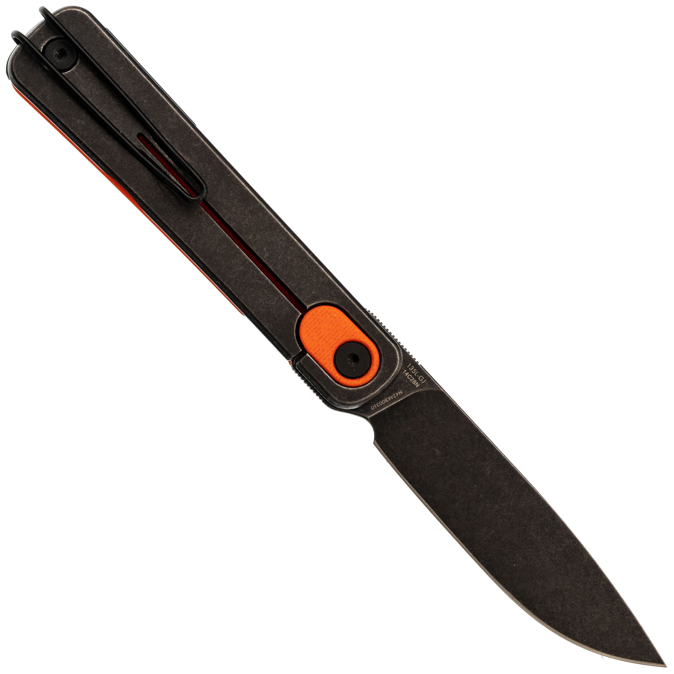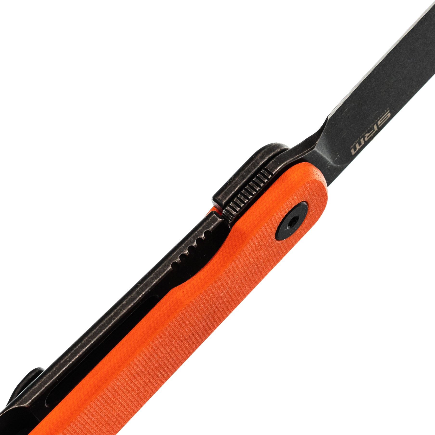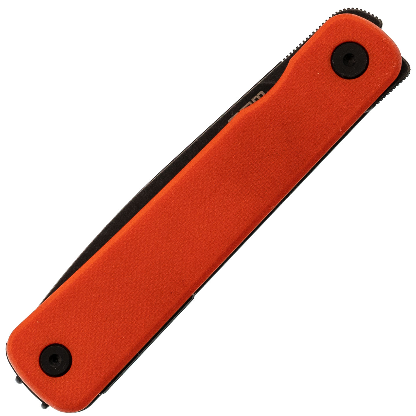 Рукоять выполнена из G10 с ярким оранжевым покрытием, что делает модель визуально выделяющейся и легко узнаваемой. Эргономичная форма адаптирована под разные типы хвата, обеспечивая комфорт даже при длительном использовании. Текстура материала предотвращает скольжение, а легкость конструкции способствует удобству при постоянном ношении. Модель сочетает в себе надежность, стиль и продуманную геометрию, делая ее актуальной для тех, кто ищет сбалансированный инструмент с характером.