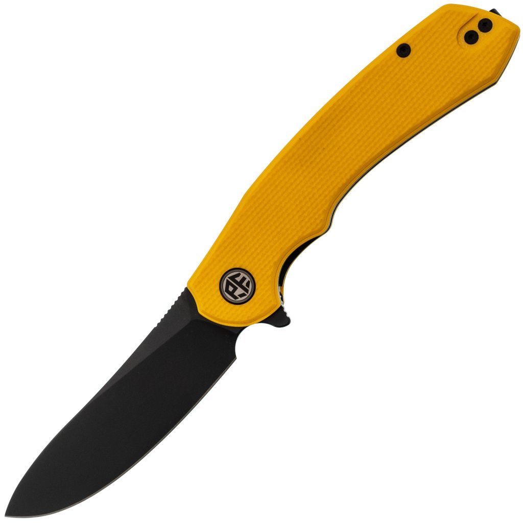 Рукоять выполнена из высококачественного стеклотекстолита G10, известного своей долговечностью и устойчивостью к износу. Особый желтый оттенок делает её заметной в гордских условиях, быстро привлекая внимание, и удачно контрастирует с черным покрытием клинка. Эргономичная форма с подпальцевыми выемками обеспечивает надёжное сцепление, а система Liner-Lock с инновационной выборкой исключает наличие острых граней, что гарантирует комфортное использование. Дополнительно предусмотрена переставляемая клипса глубокой посадки для удобного ношения.