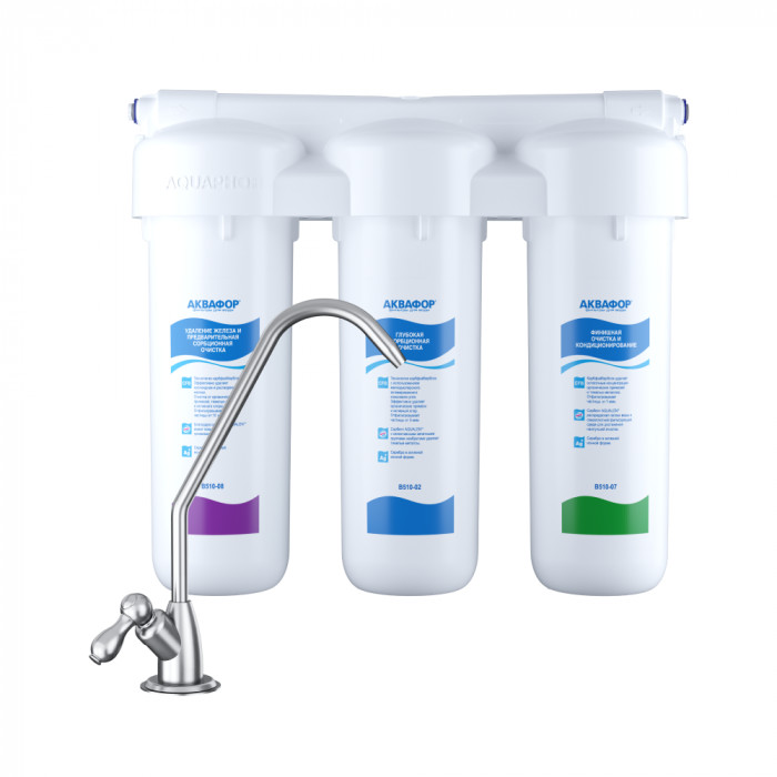 Аквафор Трио Fe надежно удаляет коллоидное железо, сохраняя минеральный состав воды. Удаляет активный хлор, тяжелые металлы, пестициды, нефтепродукты и другие распространенные загрязнители. Подает чистую питьевую воду на отдельный кран. Картриджи меняются одновременно раз в год.