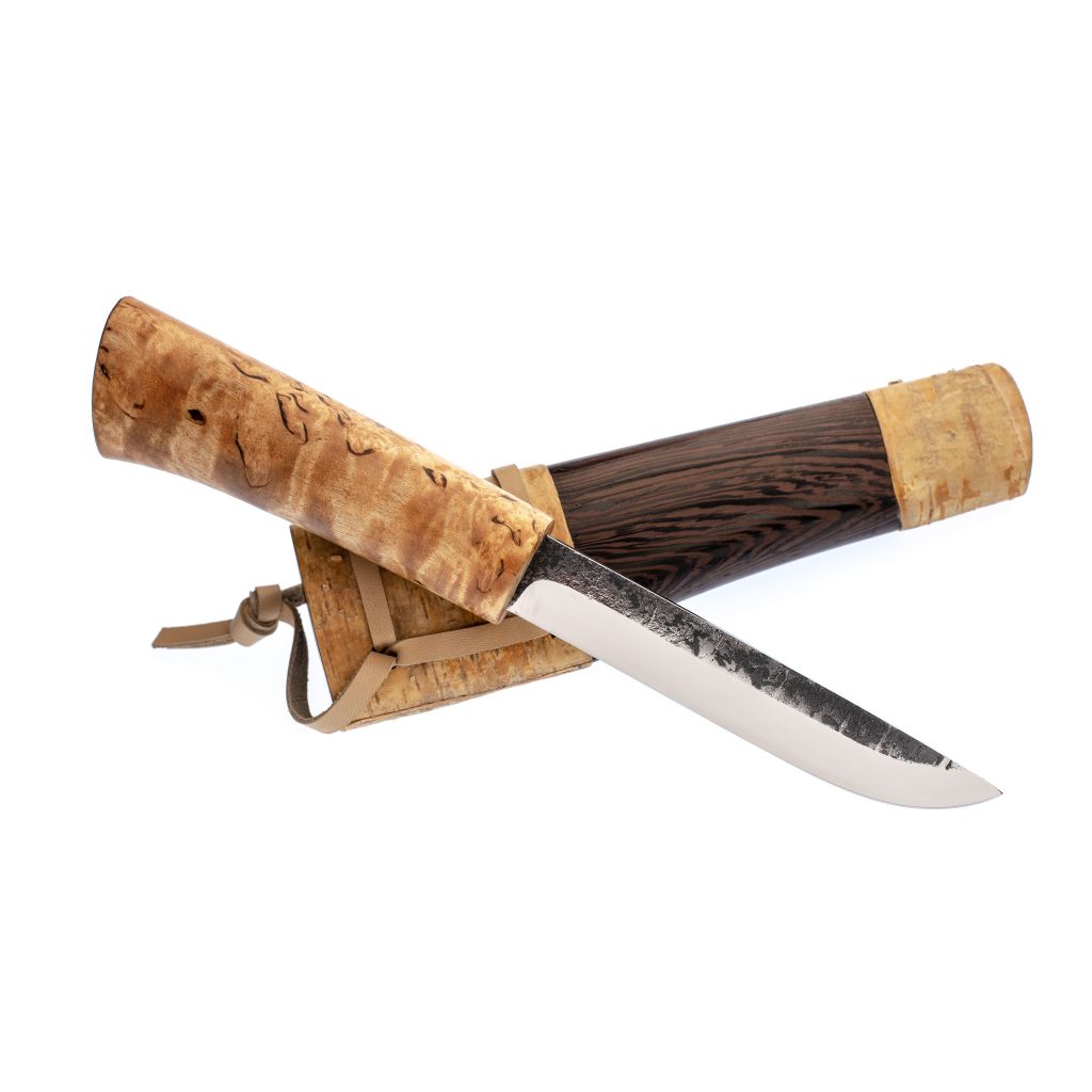 Нож Ханты-Манси в деревянных ножнах, сталь Х12МФ, берёзовый кап, венге-береста - это крутой и самодостаточный подарок для брутального мужчины. Во многих из нас есть капля (и возможно, не одна) скифской крови и поэтому формы этого клинка отзываются в нашей душе различными воспоминаниями. Узкий и длинный клинок отлично приспособлен для выполнения хозяйственных работ, приготовления пищи и проведения ремонта снаряжения в полевых условиях. Клинок выполнен из классической ножевой нержавеющей стали, которая заслуженно пользуется популярностью во всем мире. Отличительной характеристикой этого сплава является высокое содержание хрома, который отвечает за защиту от коррозии. Наличие углерода обеспечивает оптимальное соотношение «упругость–вязкость». Ножны из натуральной древесины подчеркивают древний и аутентичный характер этого ножа.