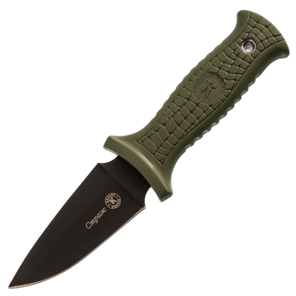 НОЖ СТРАЖ, СТАЛЬ AUS-8, РУКОЯТЬ ХАКИ, КИЗЛЯР это практичный, компактный и многофункциональный вариант для тех, кто нуждается в городском фикседе на все случаи жизни. Дизайнеры компании долго работали над этой моделью, стараясь найти оптимальное решение. За основу был взят короткий кинжал скин-ду, который используется для скрытого ношения. Его клинок был сделан более широким и одна из граней получила волнообразную заточку. Для уверенной фиксации в экстремальной ситуации рукоятка имеет глубокое рифление и двухсторонние упоры — нож уверенно и надежно сидит в руке. Плоский чехол жестко фиксирует нож даже при размещении в перевернутом состоянии. Так что вы сможете найти именно тот вариант подвеса, который удобен лично вам. Зеленый цвет рукояти и чехла позволяет использовать нож для выполнения полевых тактических операций.