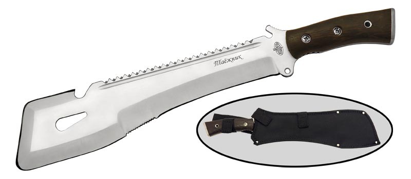 Клинок мачете Таёжник выполнен с акцентом на эффективность при рубке и других тяжёлых задачах. Баланс смещён к кончику для усиленного удара. На обухе расположена пила для распила древесины, а у режущей кромки - участок с серрейторной заточкой, удобный для работы с волокнистыми материалами. Дополнительный крюк у основания клинка позволяет снимать котелок с костра без риска обжечься.