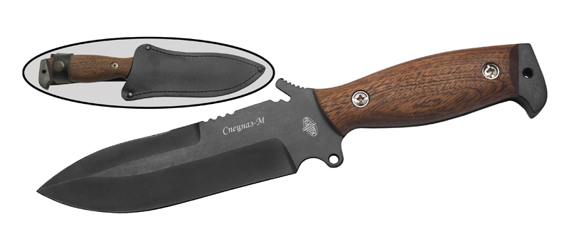 Ножны Спецназ-М изготовлены из плотной натуральной кожи и имеют конструкцию глубокой посадки клинка для минимизации люфта. Жёсткий подвес позволяет надёжно фиксировать нож на поясе или снаряжении, исключая случайные смещения при активном движении. Защита клинка от пыли и влаги сохраняет его в рабочем состоянии, а классическая отделка кожаных ножен гармонирует с эстетикой рукояти из Сапелли.