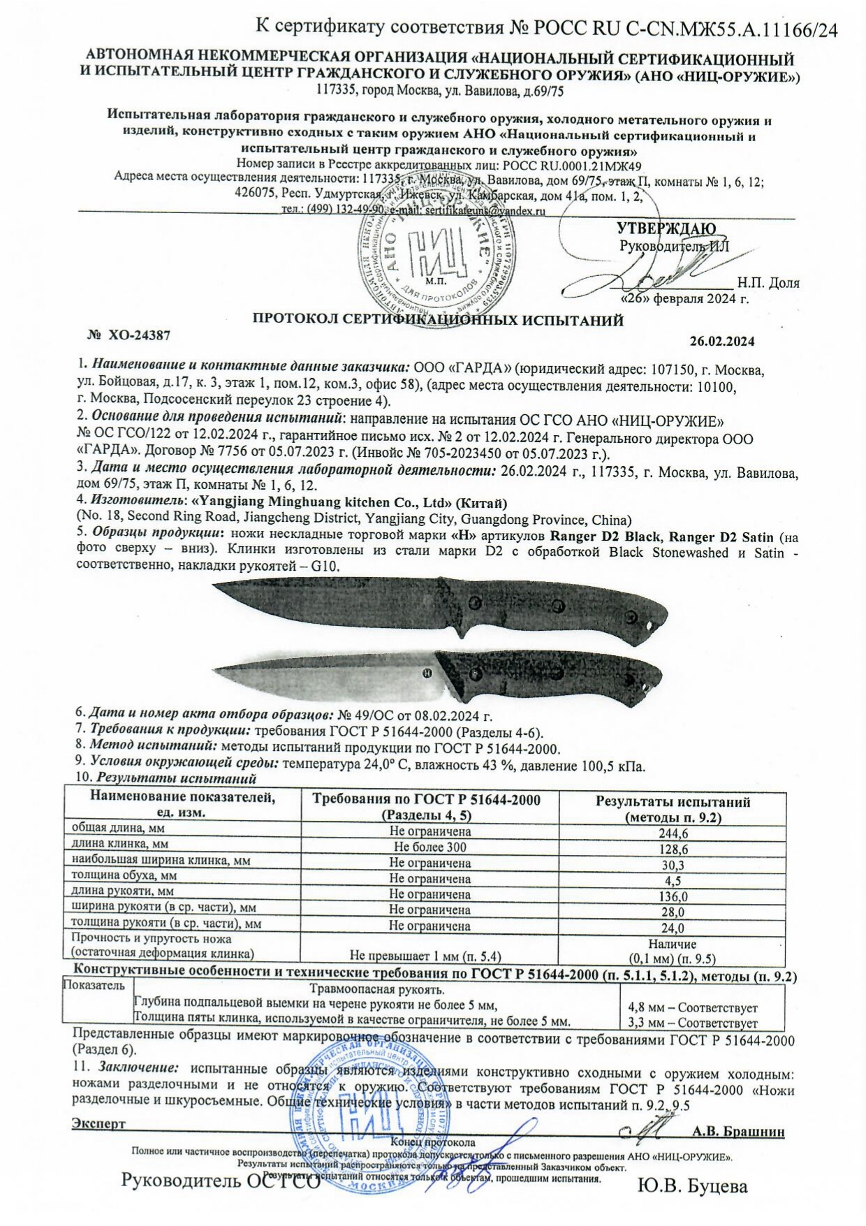 Сталь D2. Полу-нержавеющая инструментальная сталь с высоким содержанием углерода и хрома. Обеспечивает отличную стойкость к износу и долго держит заточку. Поверхность клинка заполирована, что помогает снизить риск появления питтинговой коррозии.
